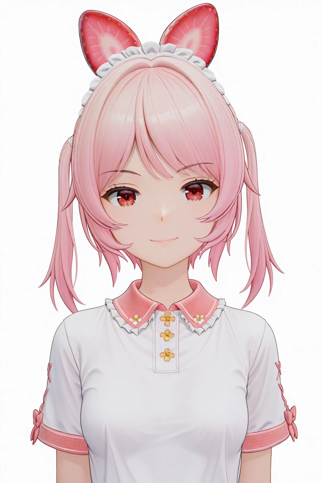 1girl, solo, adult, small , red eyes, pink hair, short hair, two side up, twintails, frilled headband, strawberry ears,