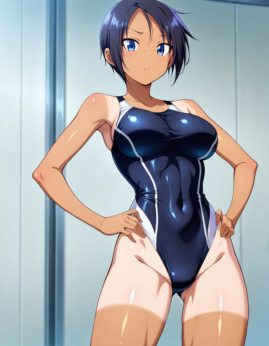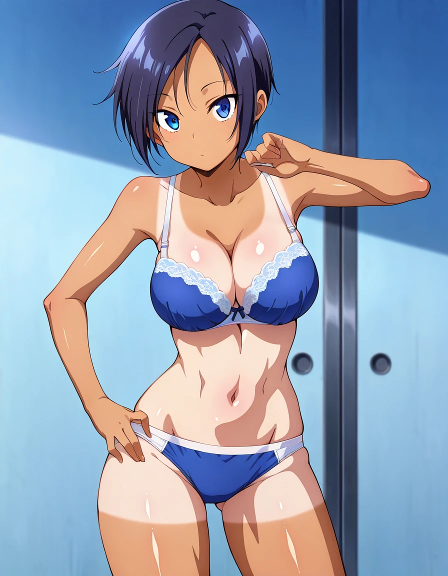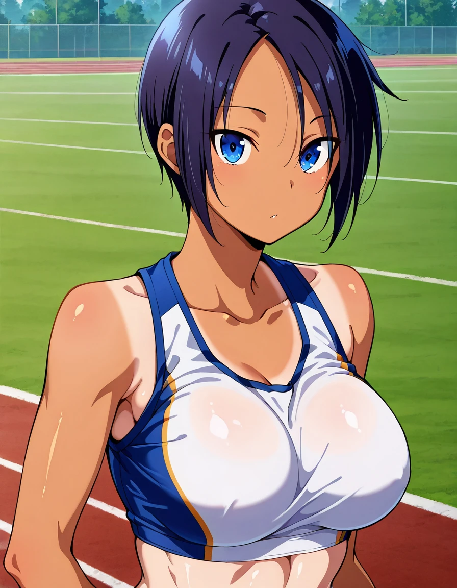 kimiaya, tomboy, short hair, dark skin, dark-skinned female, tan, tanlines, shorts tan, large breasts, or medium breasts,