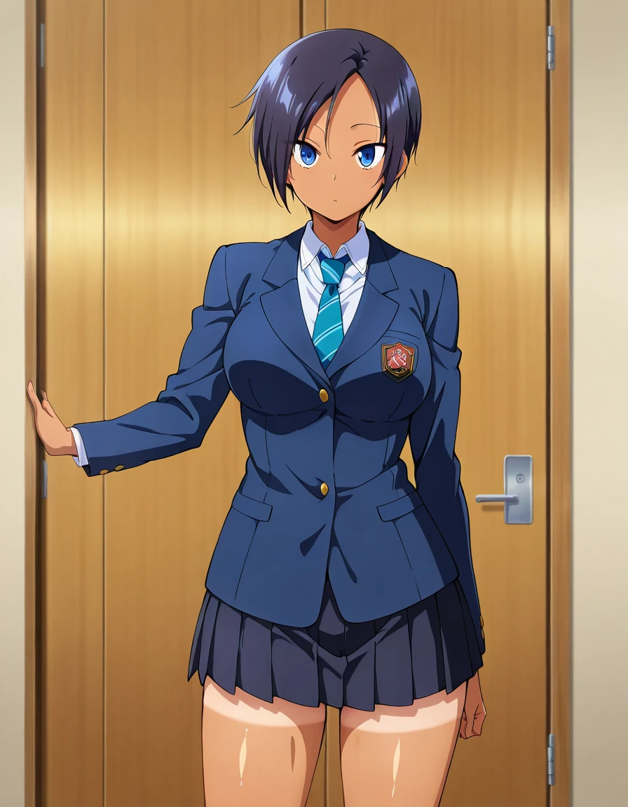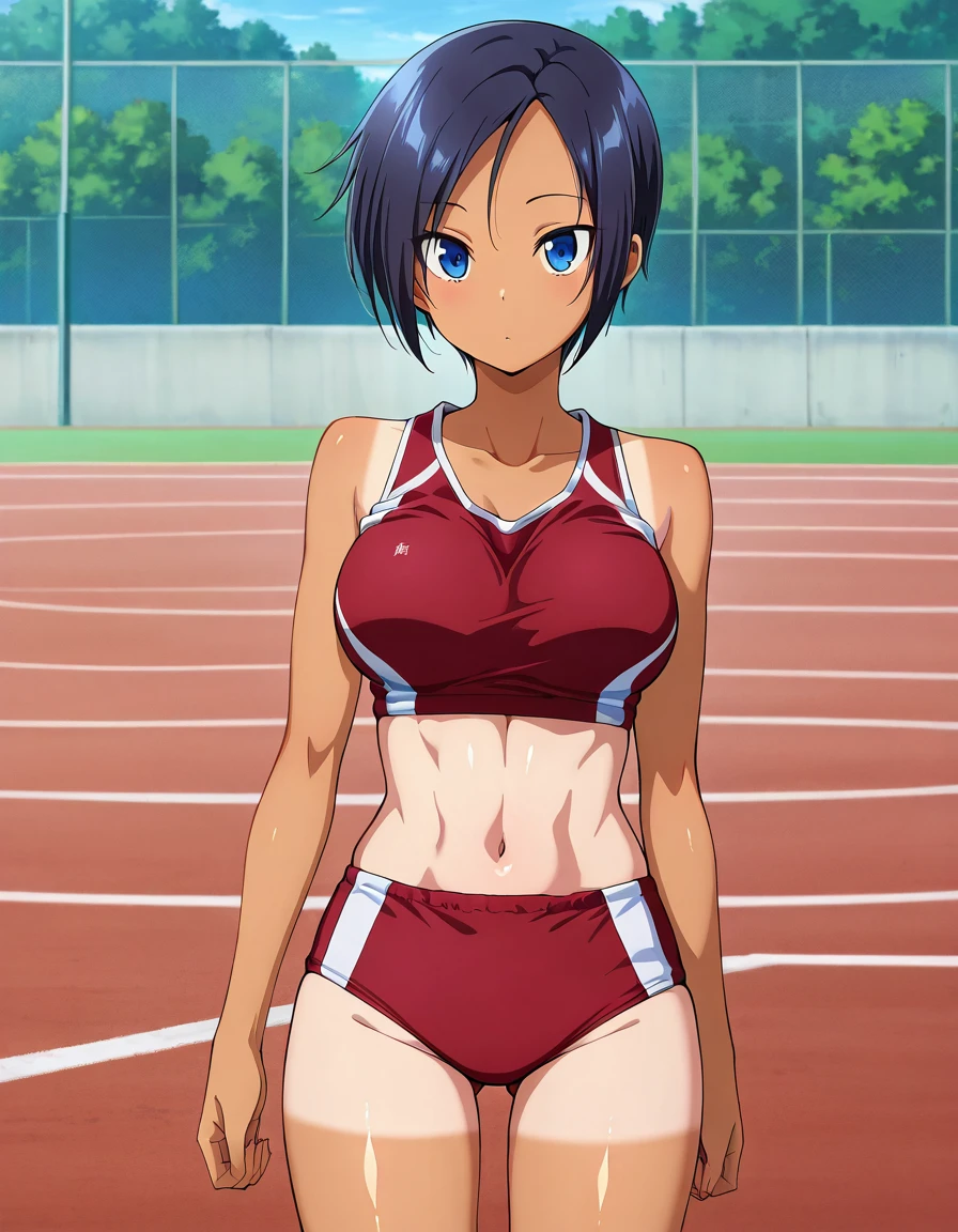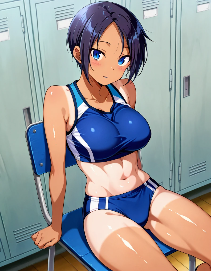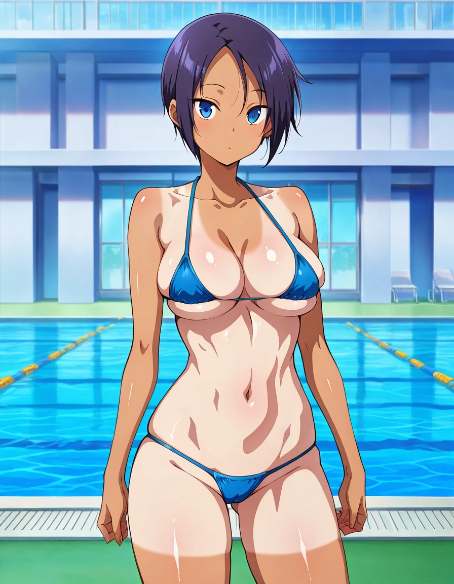 kimiaya, tomboy, short hair, dark skin, dark-skinned female, tan, tanlines, shorts tan, large breasts, or medium breasts,