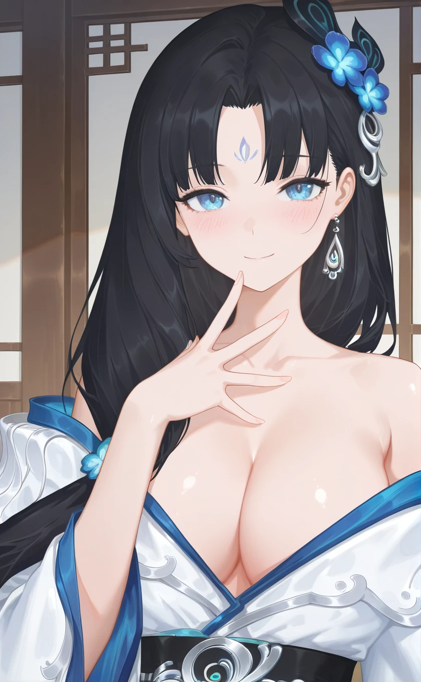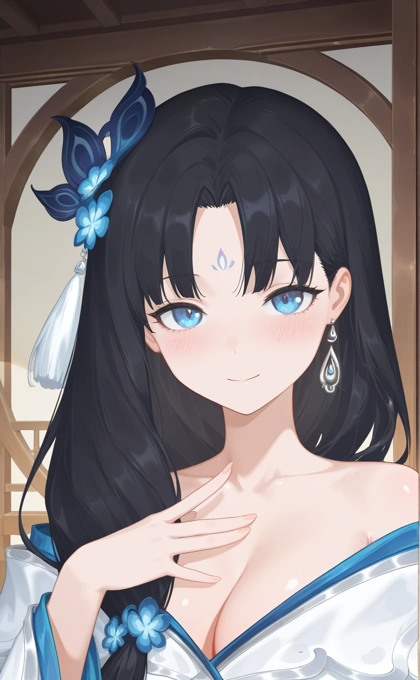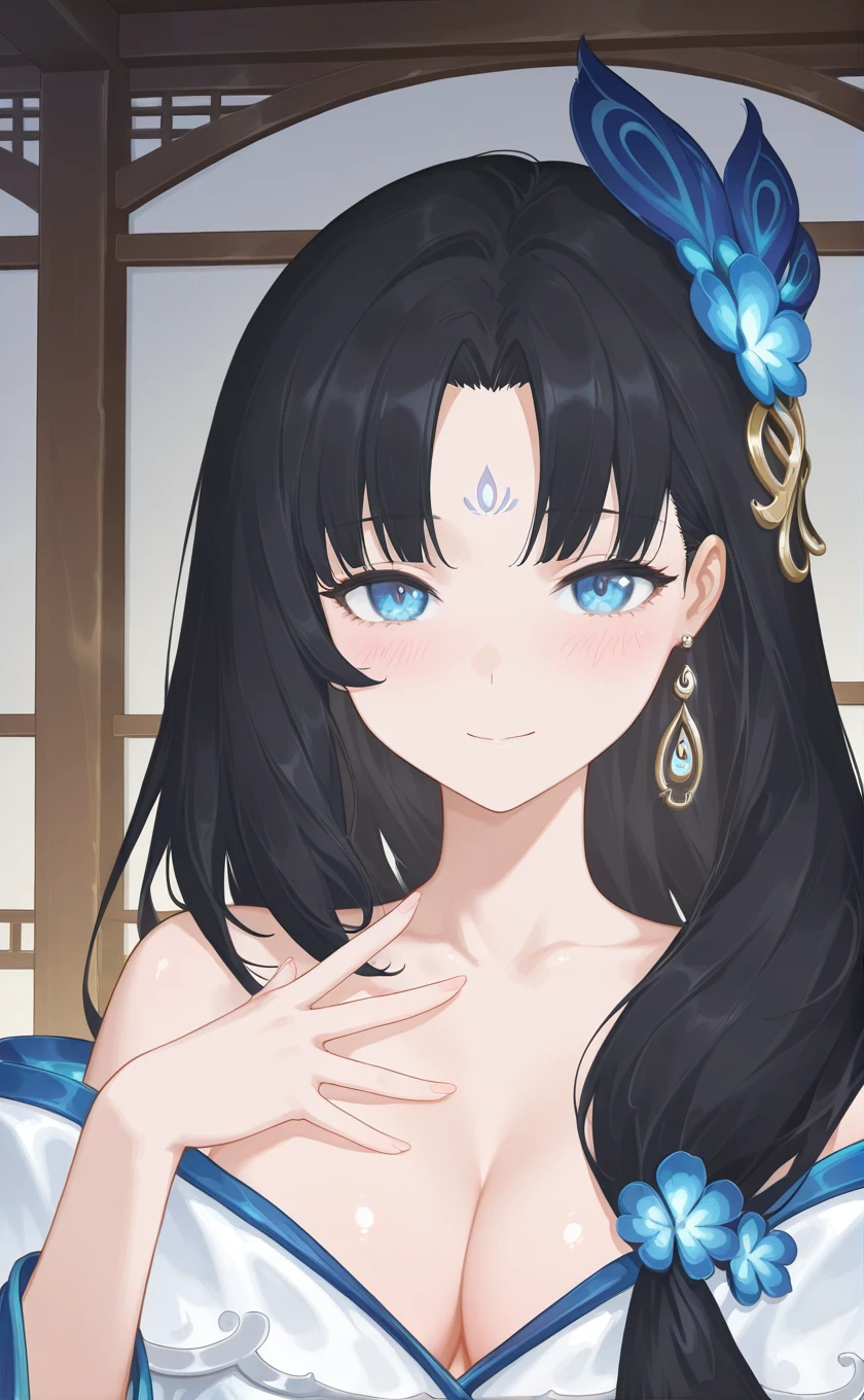 very long hair,black hair,hair ornament,hair flower,blue flower,earrings,parted bangs,forehead mark,blue eyes