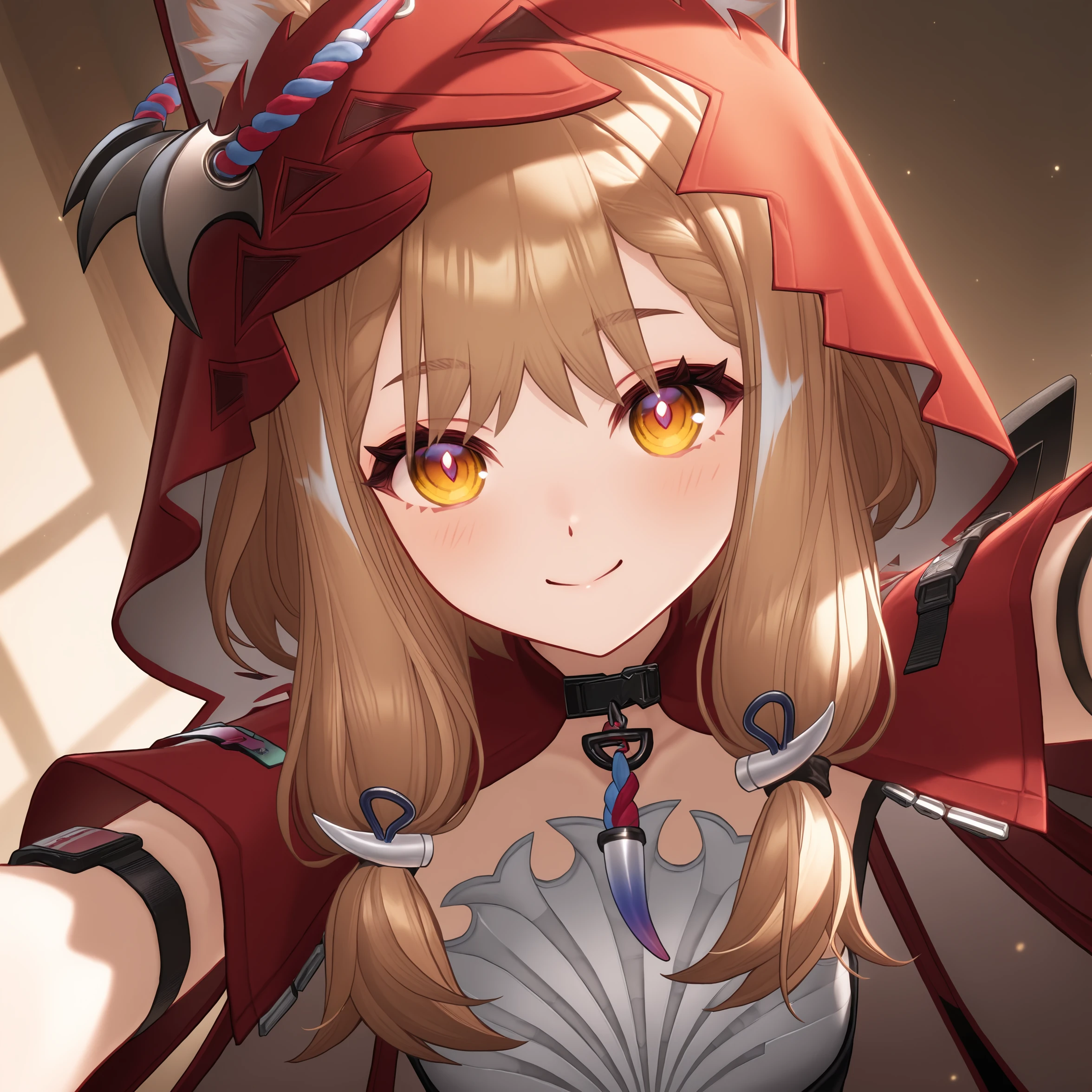 masterpiece, best quality, very aesthetic, newest, hires, Rossi, 1girl, solo, smile, blush, looking at viewer, closed mouth, upper body, black gloves, simple background,For full-body shots, you can try adding full body or boots.