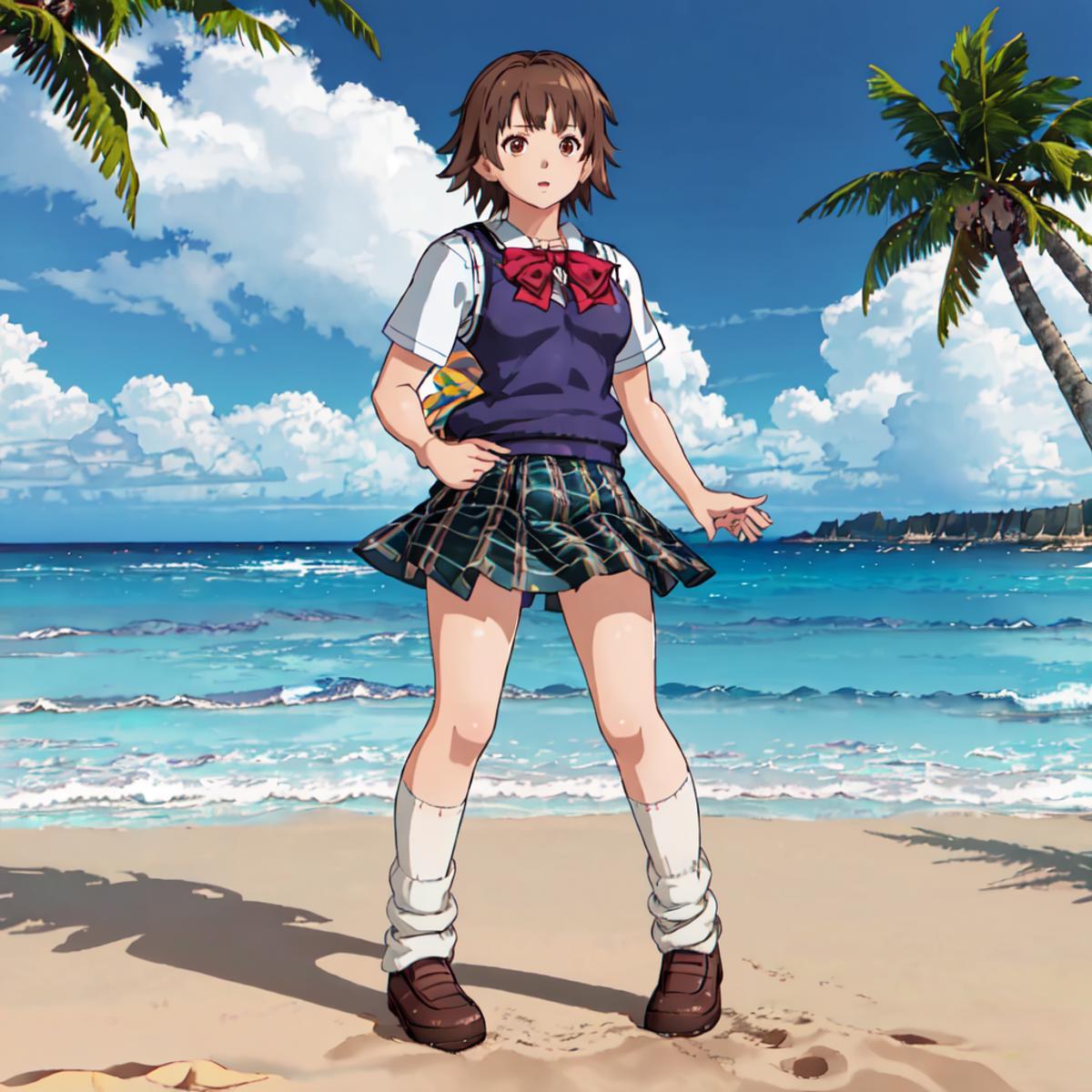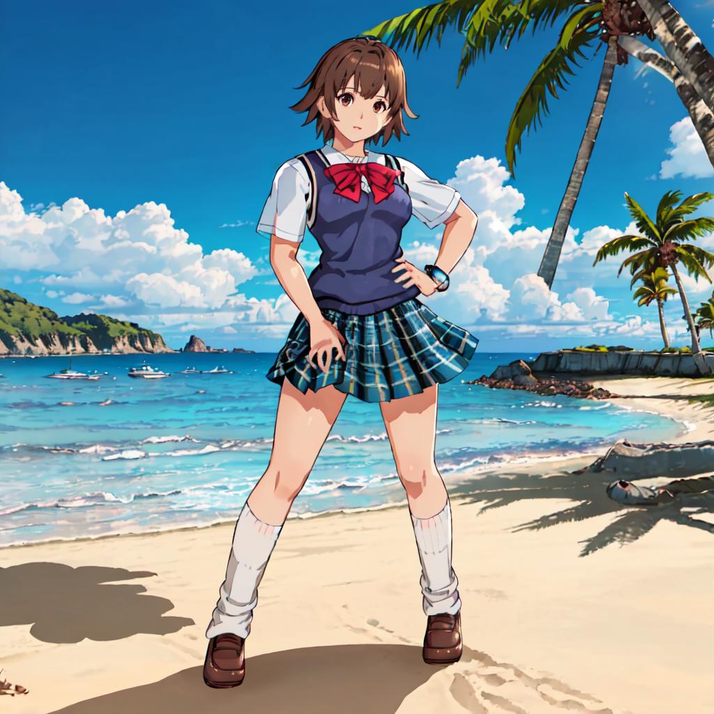 School Uniform : Miharu_Hirano_Tekken, 1girl, solo, short hair, brown hair, brown eyes, bow, school uniform, plaid skirt, blue sweater vest, loose socks
