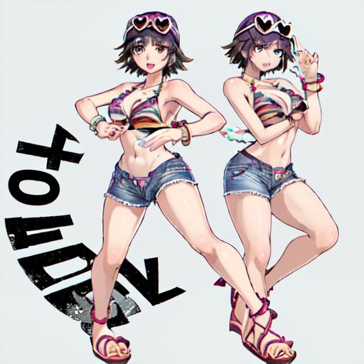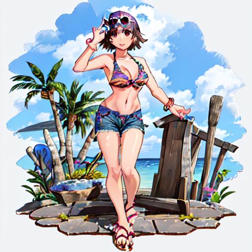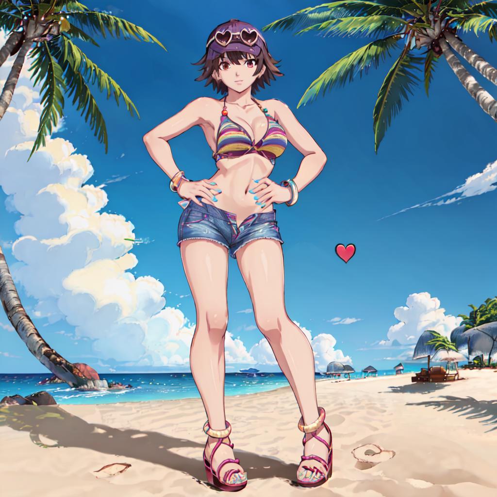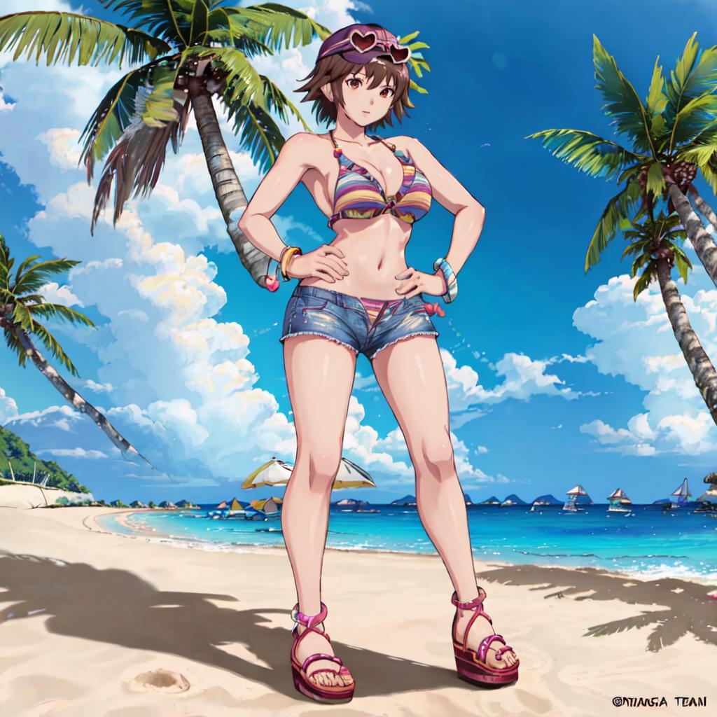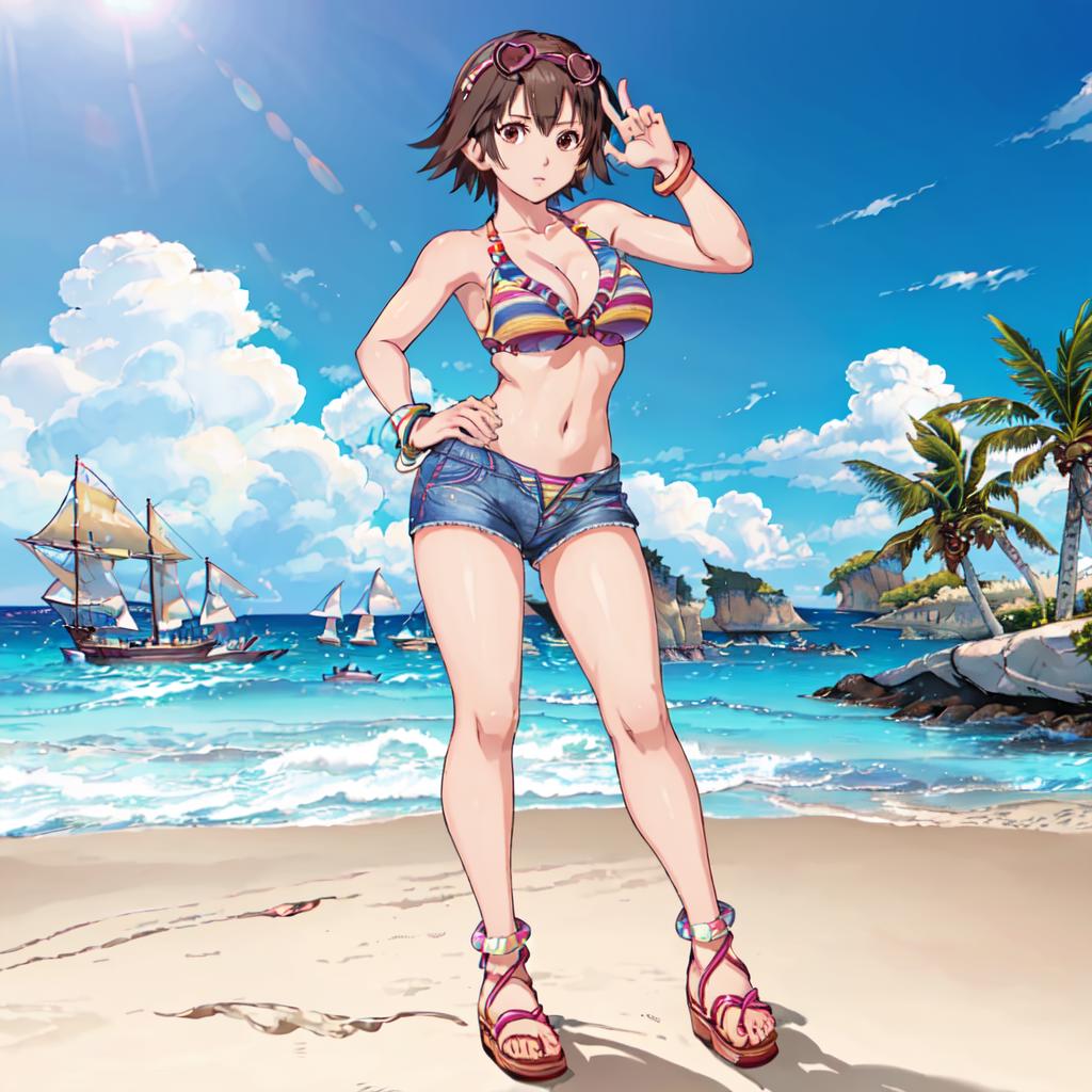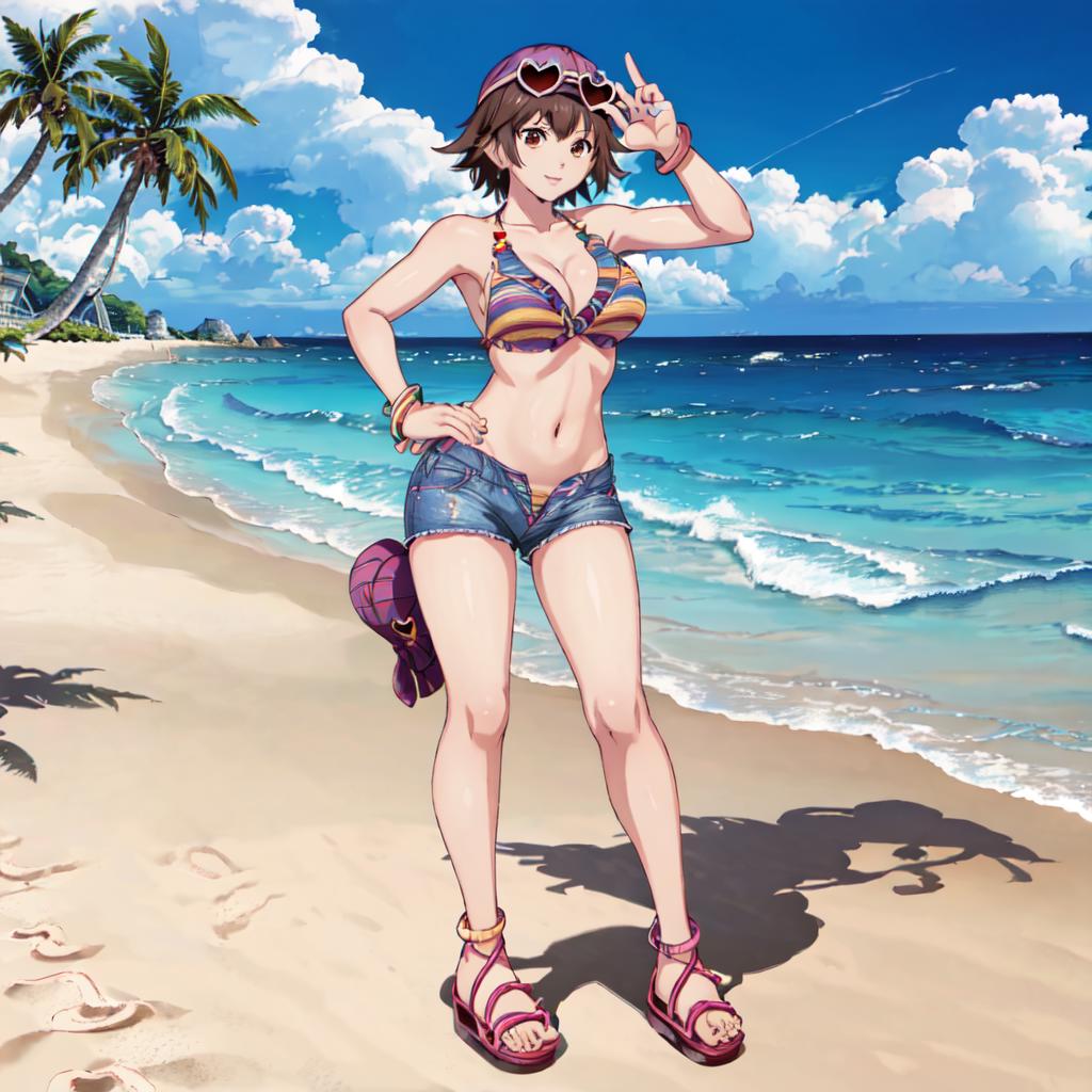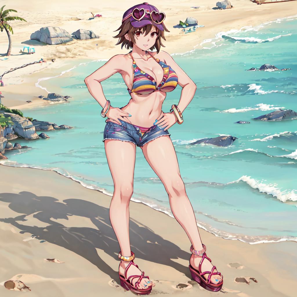 Bikini 1 : Miharu_Hirano_Tekken, 1girl, solo, short hair, brown hair, navel, cleavage, brown eyes, medium breasts, bikini, striped, bracelet, short shorts, sandals, bikini top only, blue shorts, denim shorts, hat, sunglasses, heart-shaped eyewear