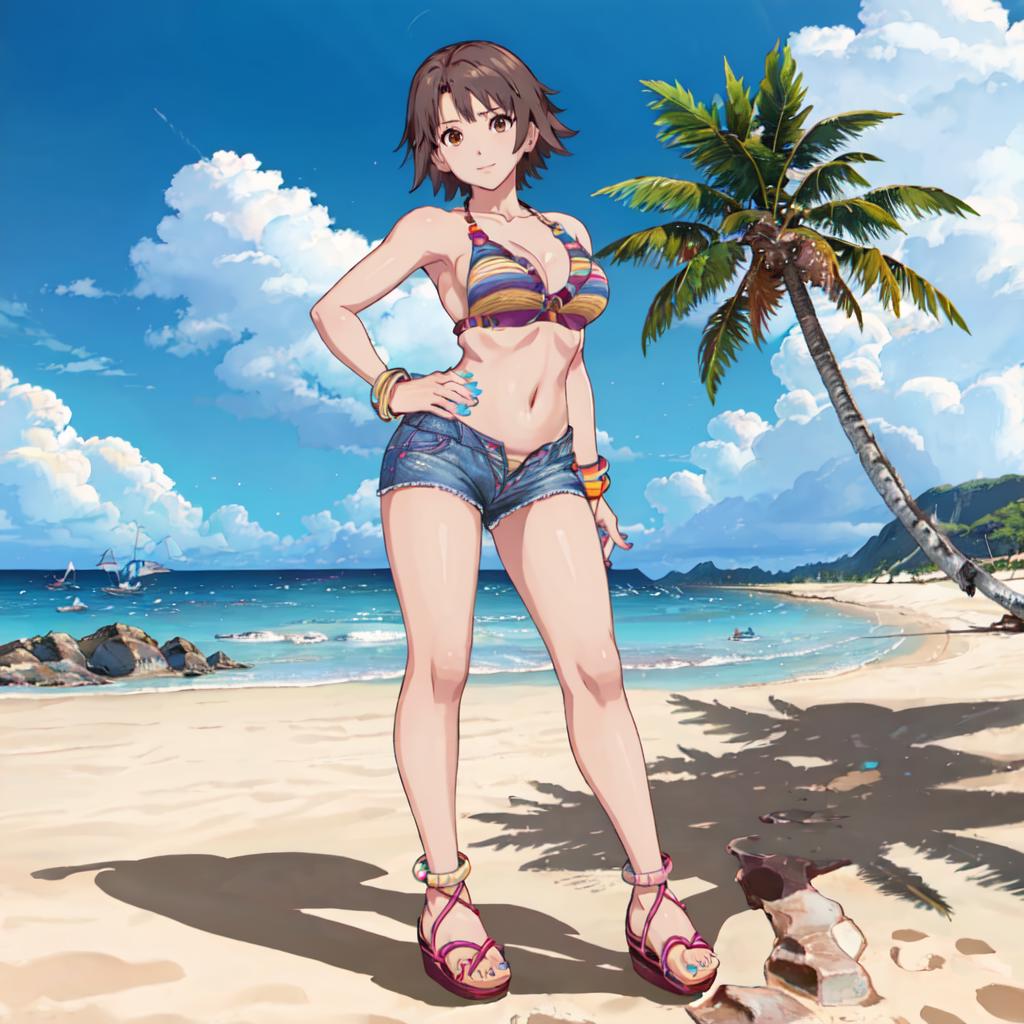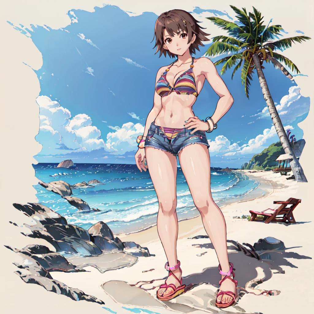 Bikini 2 : Miharu_Hirano_Tekken, 1girl, solo, short hair, brown hair, navel, cleavage, brown eyes, medium breasts, bikini, striped, bracelet, short shorts, sandals, bikini top only, blue shorts, denim shorts