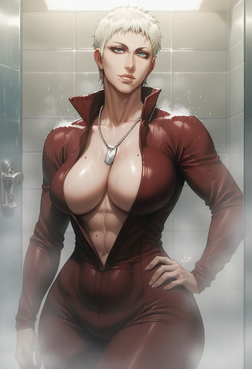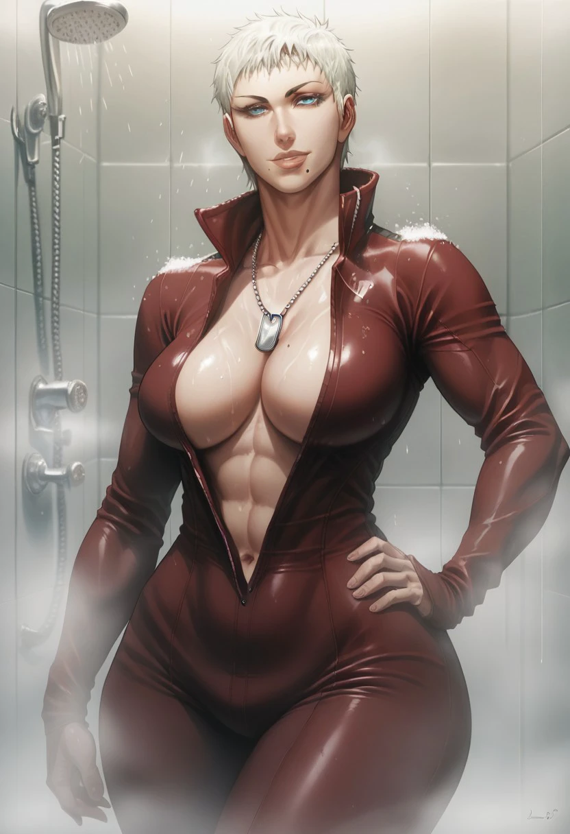 Elena is a tall woman with short spiky blonde hair and large breasts. She also has a mole on the bottom left side of her chin.