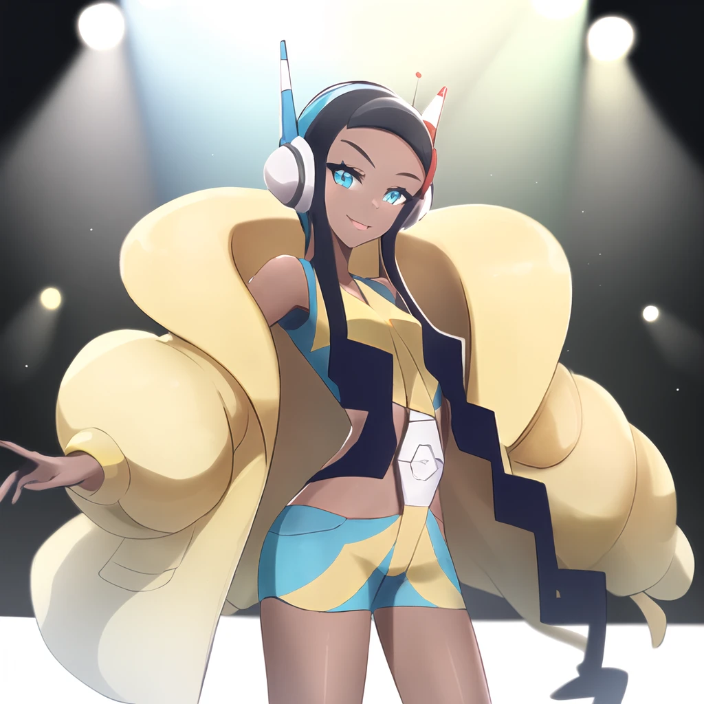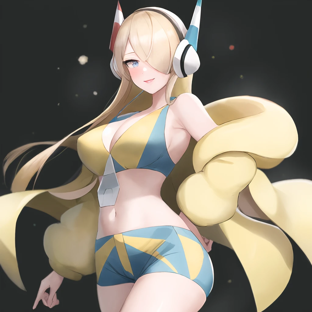 Clothing: headphones, headgear, navel, fur coat, yellow coat, open coat, coat, jacket, yellow jacket, open jacket, crop top, shorts, short shorts