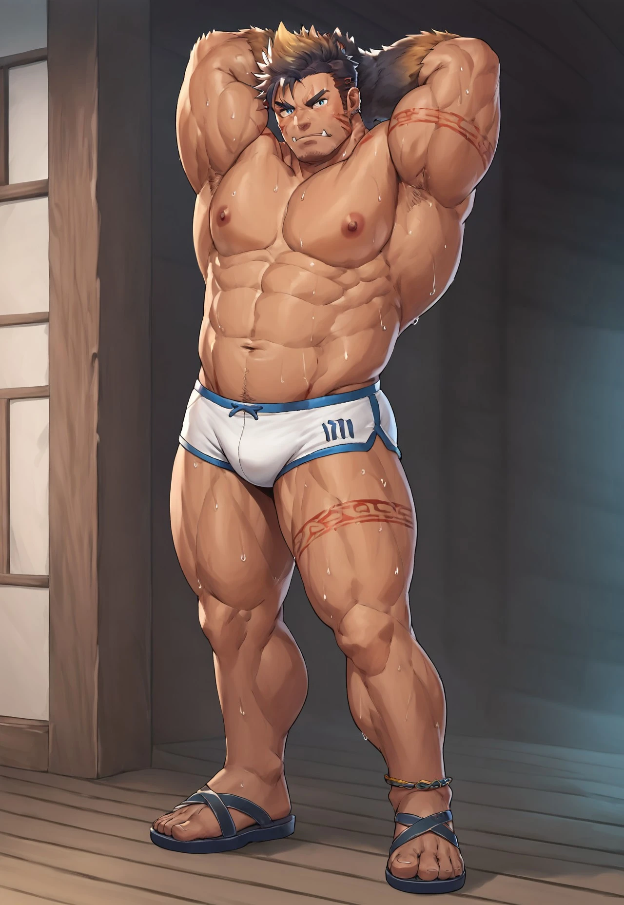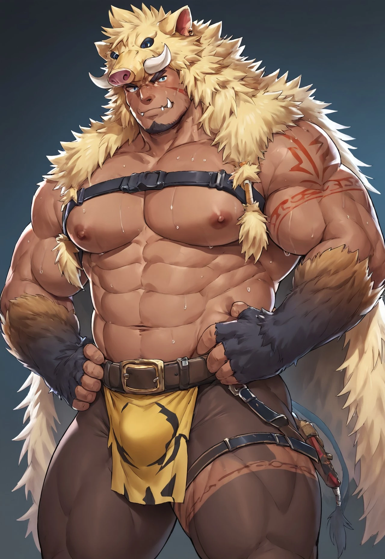 Clothing Prompt : Animal hood, fur gloves, blue shirt , white brief , speedo, chest harness