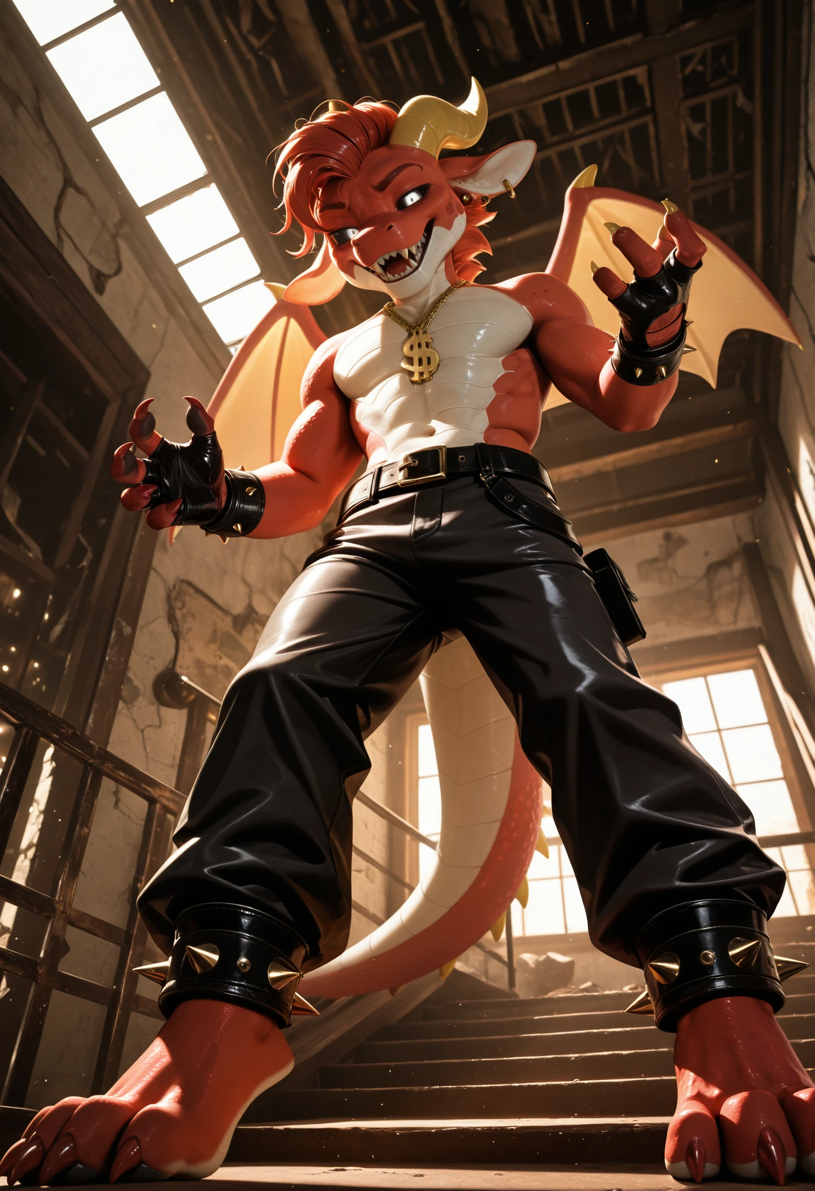 s1mon_sm0ke, solo, dragon, cute, anthro, horns, horn, 1boy, male, red body, furry, male focus, wings, tail, sharp teeth, dollar sign necklace, furry male, sharp teeth, dragon boy, claws, dragon horns, jewelry, white eyes, black sclera, earrings, piercing, looking at viewer👚 Additionally for clothes / Дополнительно для одежды - leather anklets with metal spikes, metal bands, clothed, gothic style, muscular, belt with metal spikes