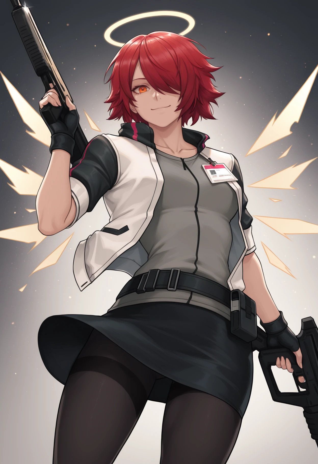 Default Outfit: exidef, detached wings, energy wings, short hair, red hair, hair over one eye, halo, orange eyes, white jacket, id card, black belt, belt pouch, short sleeves, raglan sleeves, black gloves, fingerless gloves, black skirt, miniskirt, black pantyhose