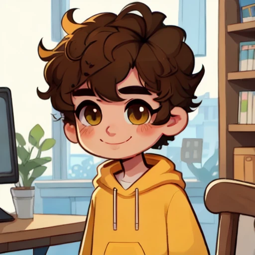 xeroup, A boy, in a yellow sweatshirt, Curly Hair, Hair Color Brown, Eye Color Brown, cartoon style, 2d, 1boy, solo,