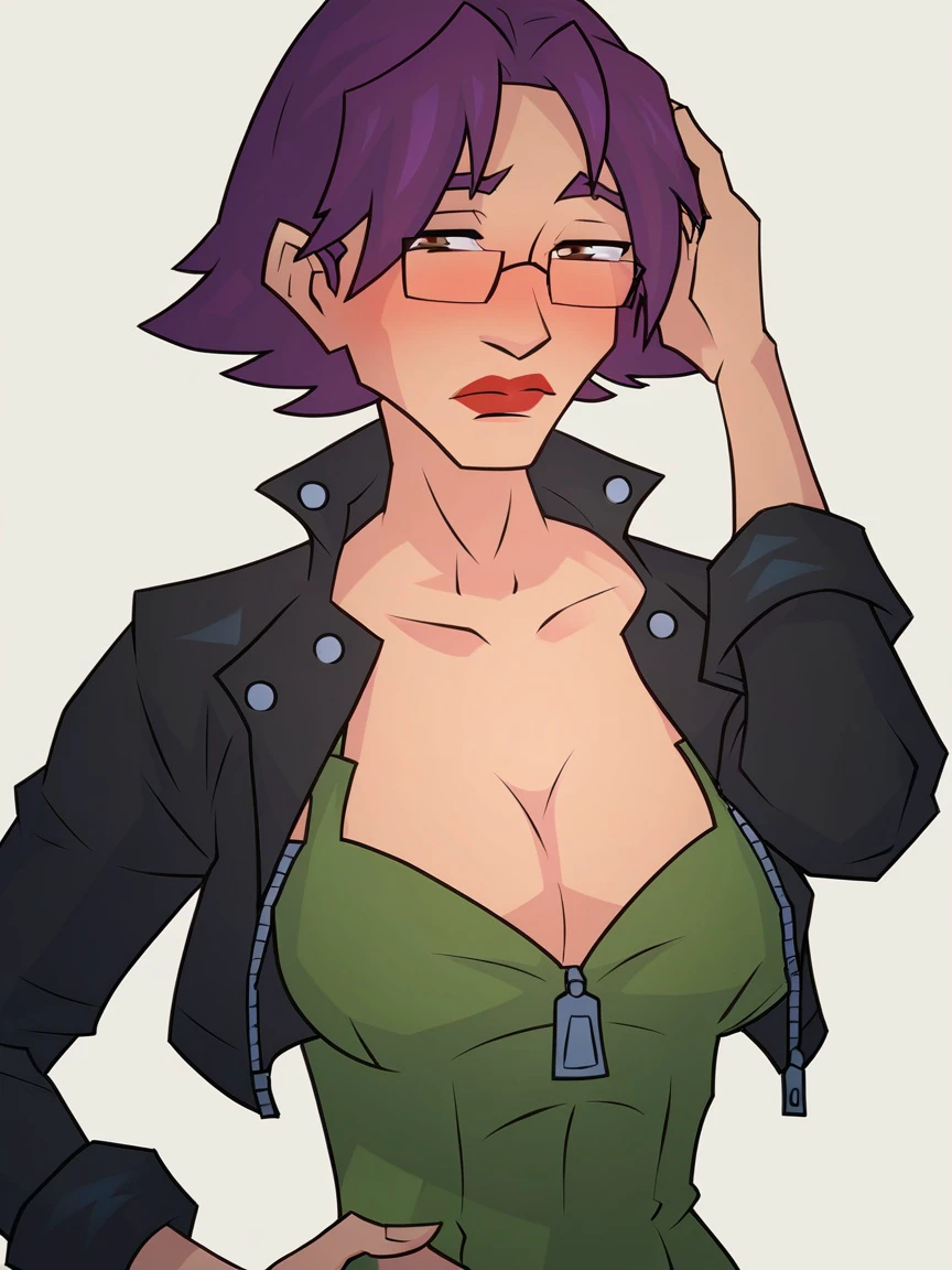 baka's mother \(mnf\), short hair, purple hair, ahoge, parted bangs, brown eyes, pince-nez, rectangular eyewear, mature female