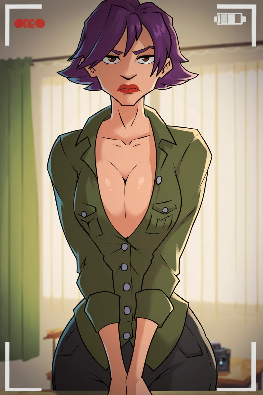 cleavage, collarbone, pants, grey pants, apron, green shirt, slippers, pants rolled up, short sleeves