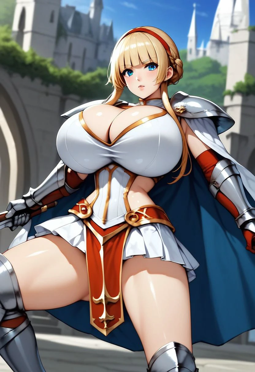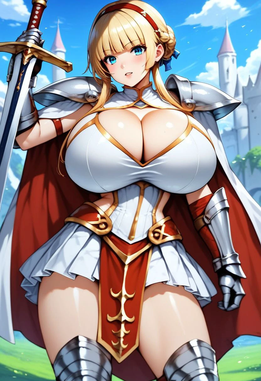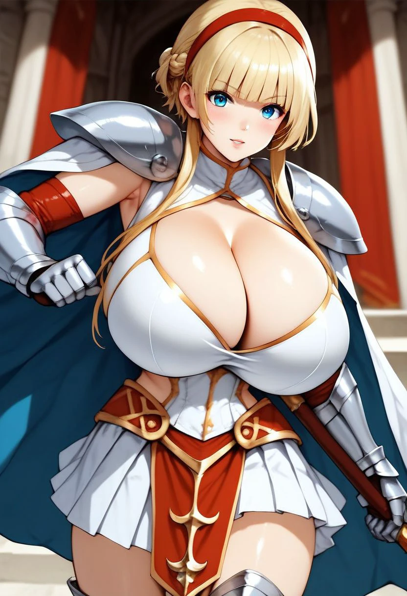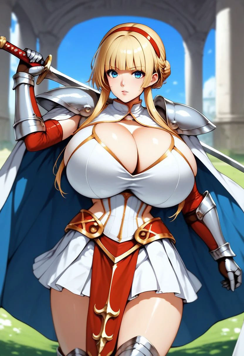 white dress, pleated skirt, red loincloth, huge breasts, cleavage cutout, silver armor, shoulder armor, gauntlets, greaves, cape,
