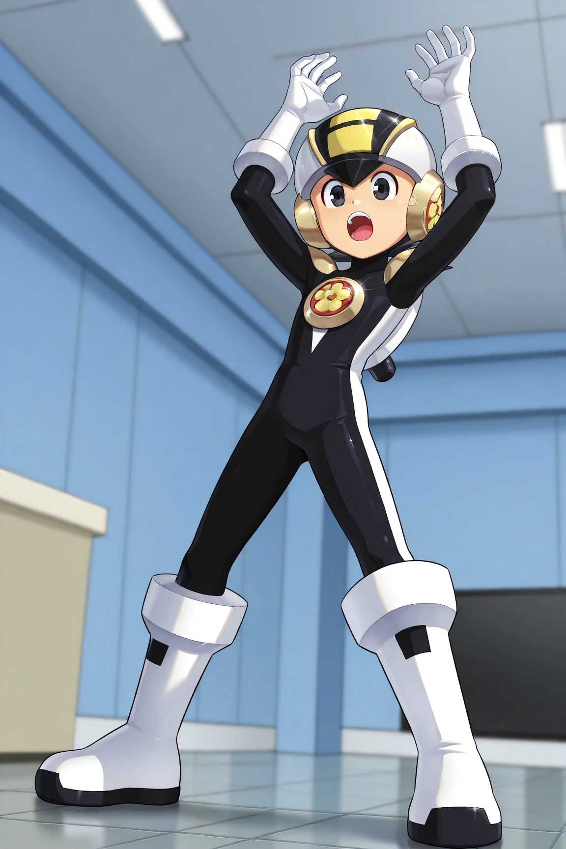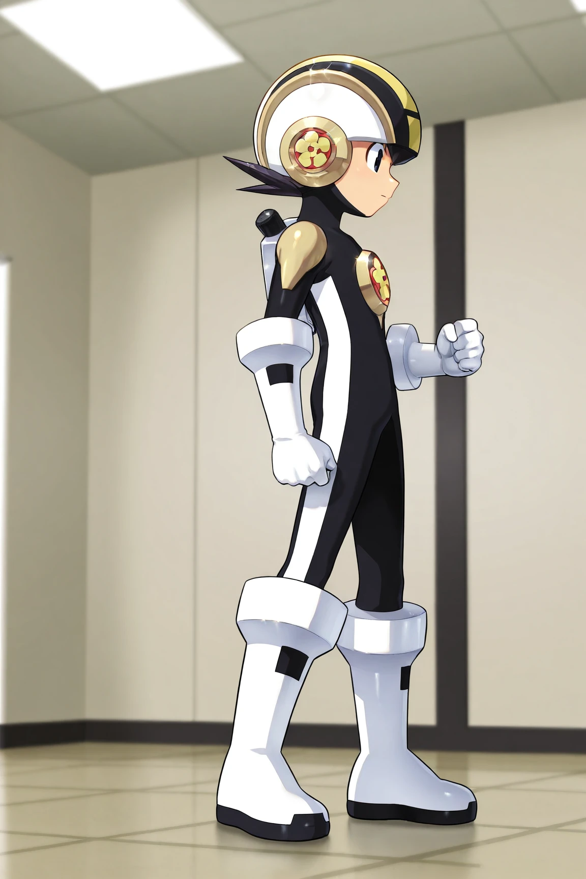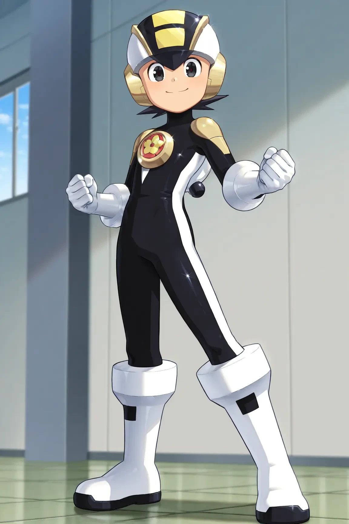 mega_hana, black hair, black eyes, black bodysuit, white helmet, white glove, white boots