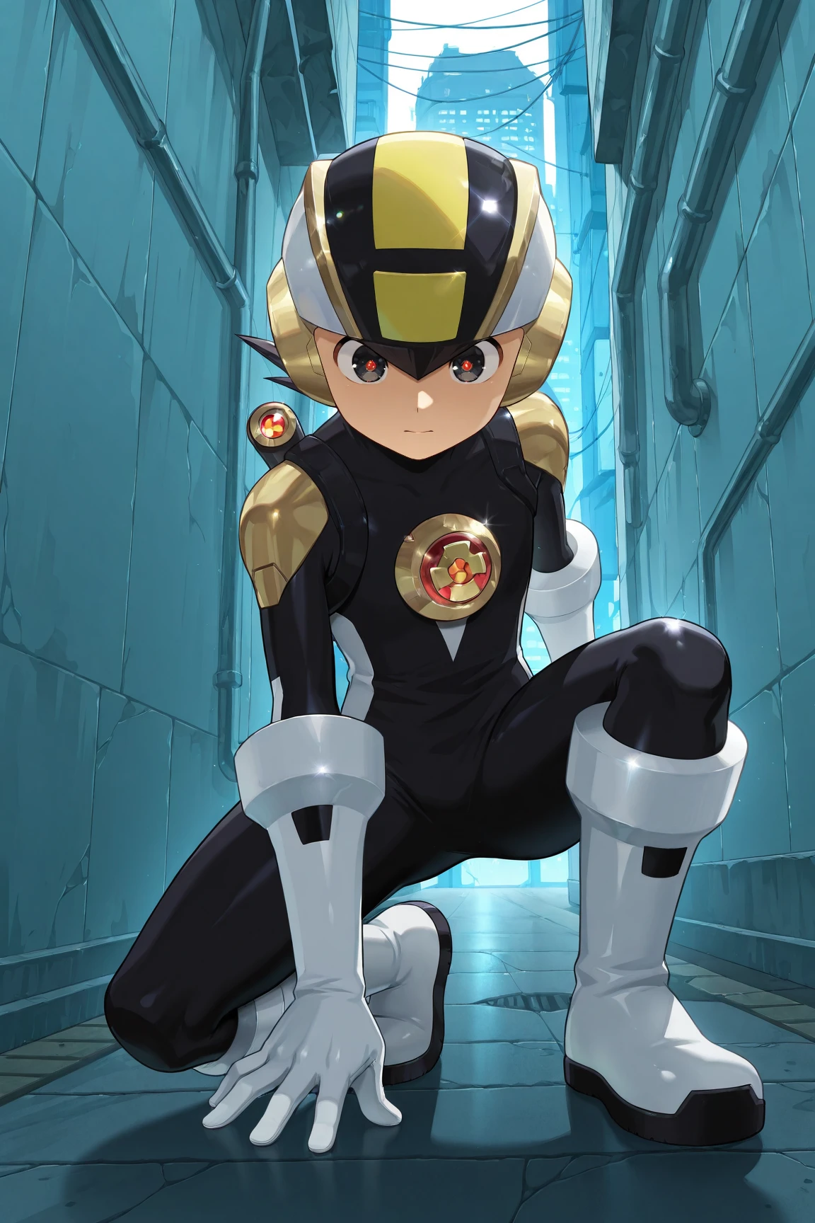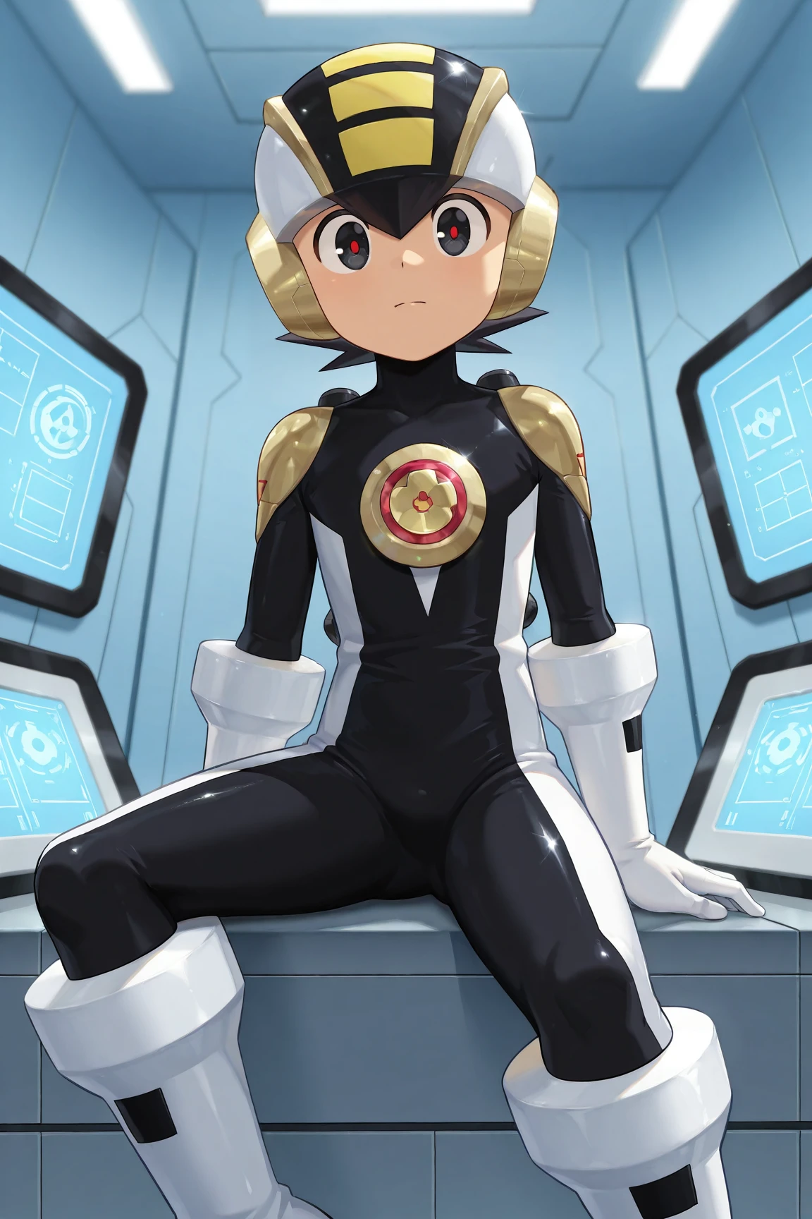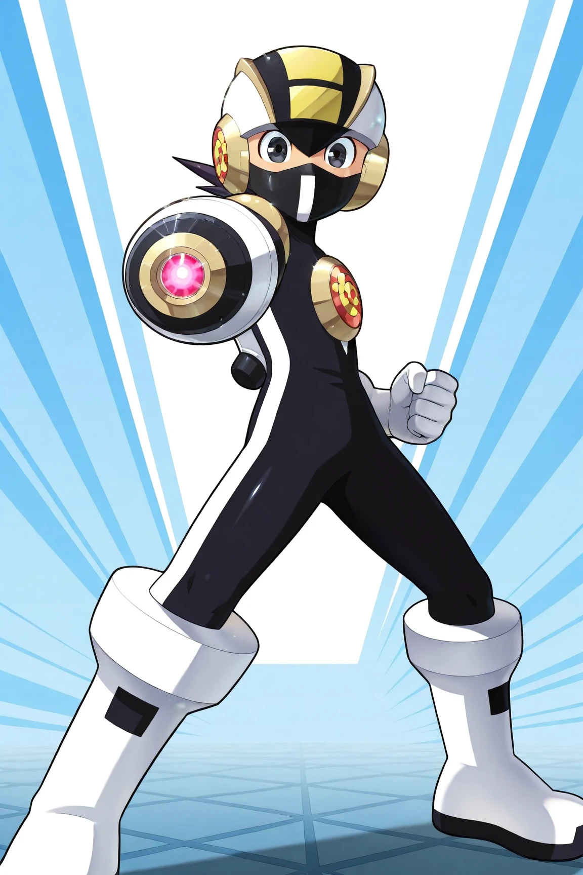 mega_hana, black hair, black eyes, black bodysuit, white helmet, white glove, white boots