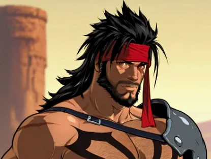jecht, black hair, navel, holding, weapon, male focus, outdoors, sword, red eyes, upper body, armor, chest tattoo, muscular, headband, facial hair, chain, scar, bandages, abs, pectorals, muscular male, spiked hair, shoulder armor, gauntlets, bara, beard, scar on face, ??????? male, mature male, bandaged arm, manly, planted, single pauldron, dizdoodz, chest hair, navel hair, pubic hair