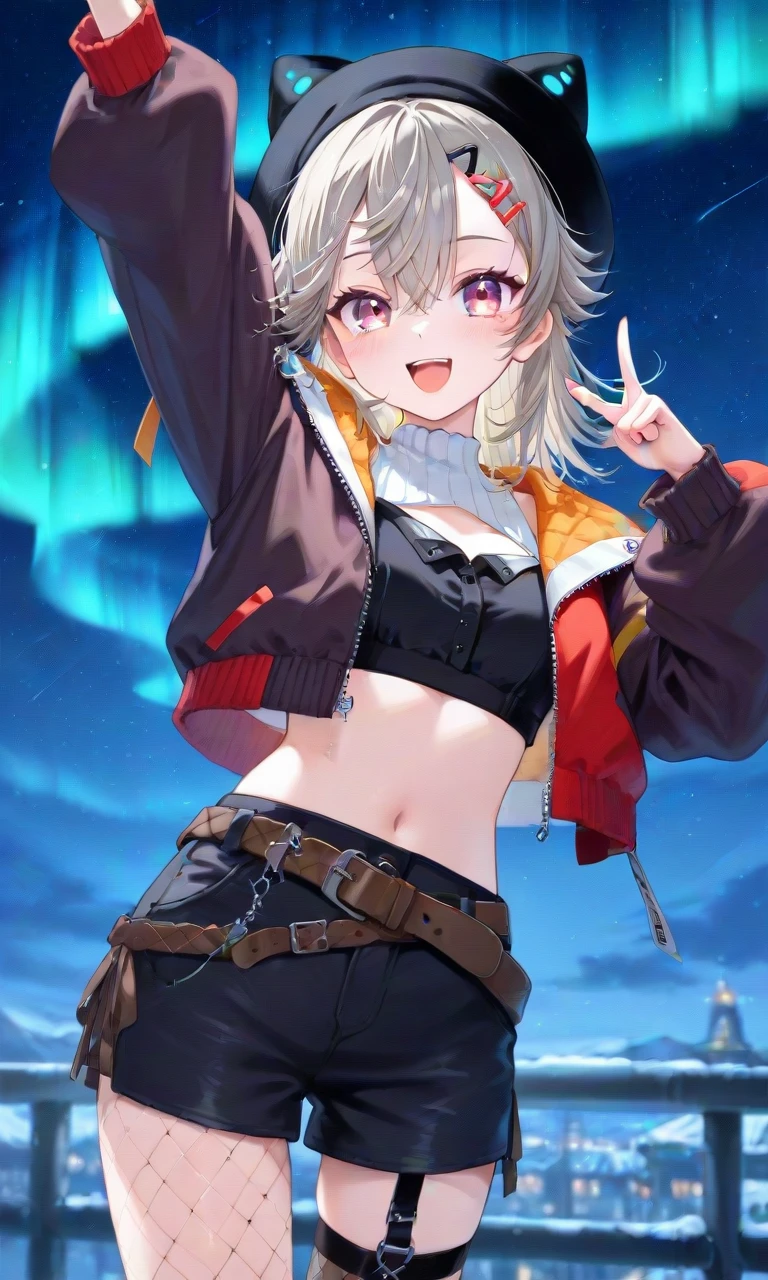• 🪐Vspo! original outfit : met default, medium hair, hairclip, beret, two-tone jacket, open jacket, black crop top, black shorts, brown belt, single thighhigh, fishnet thighhighs