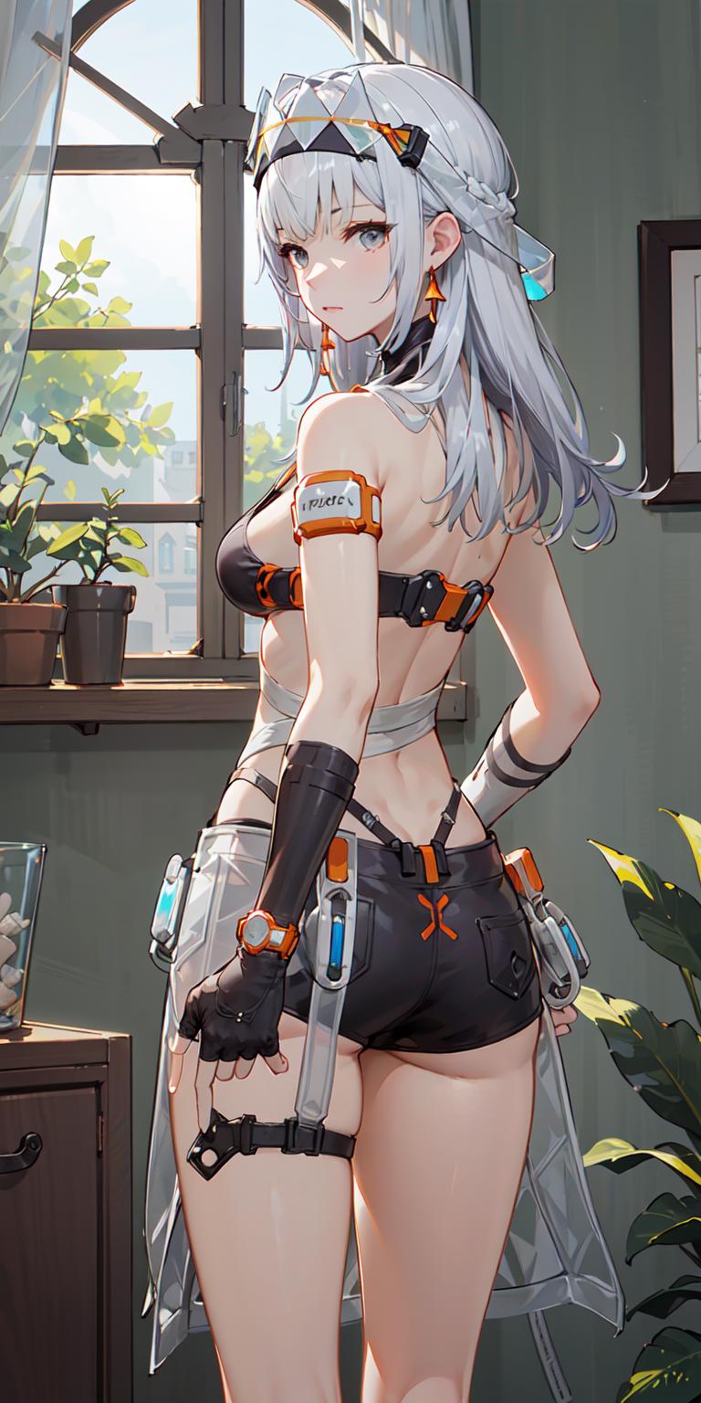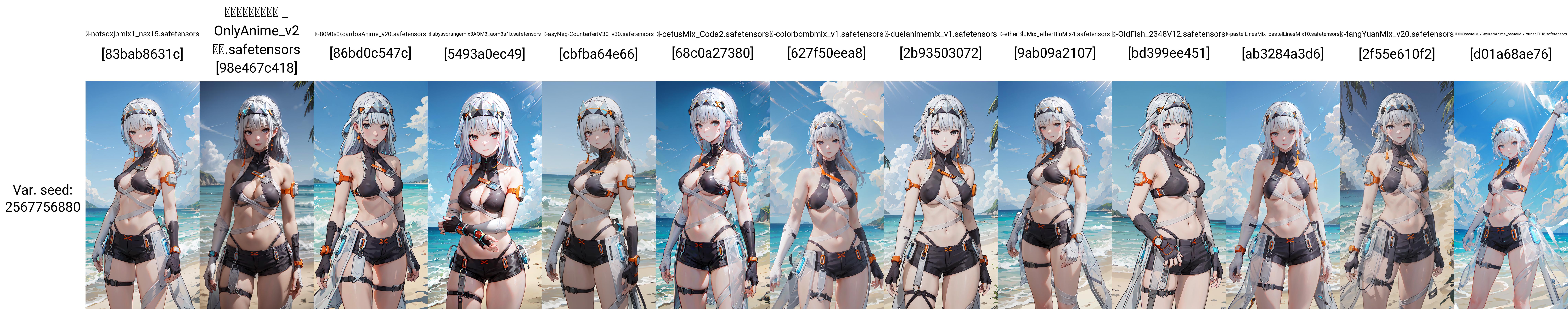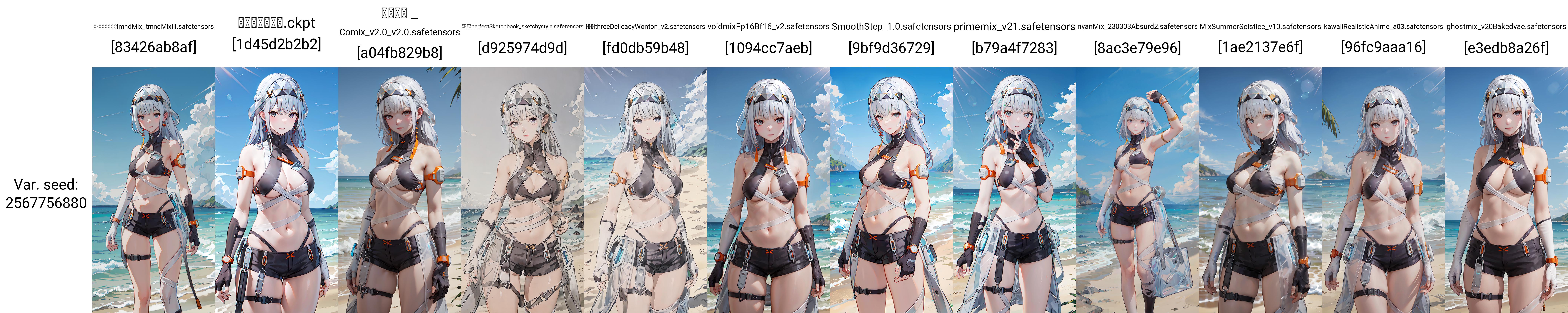 【正面提示词Positive prompt】:chenxingS, bikini, short_shorts, thigh_strap, around_waist, see-through, bandaged_body, asymmetrical_elbow_gloves, fingerless, headgear, earrings, white_hair, long_hair, grey_eyes, id_card, armlet, watch, 1girl, solo, standing, looking at viewer,cowboy shot, beach, ocean, day, blue_sky, dappled sunlight, (masterpiece,best quality,beautiful and aesthetic:1.2), <lora:chenxingS-v2:0.7>