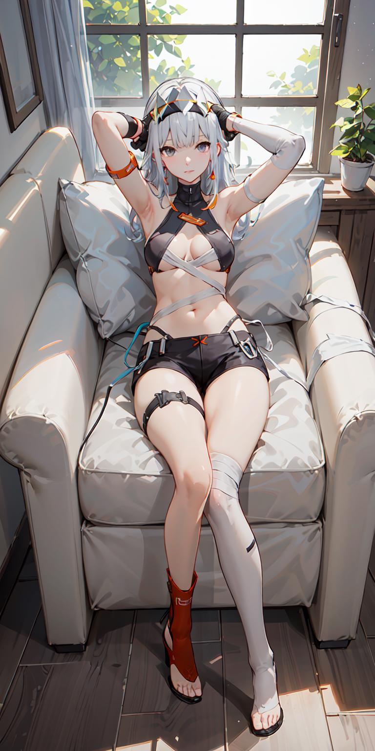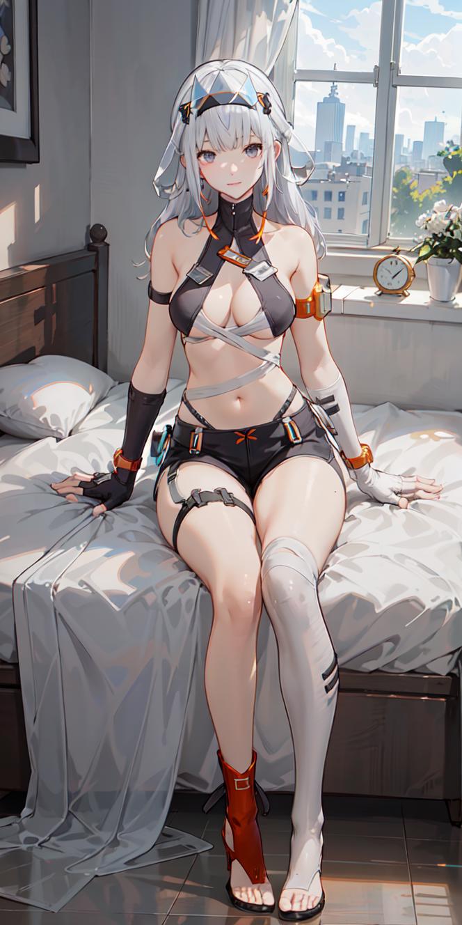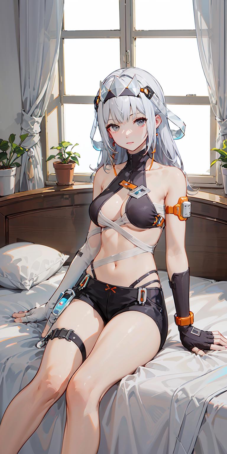 chenxingS, bikini, short_shorts, thigh_strap, around_waist, see-through, bandaged_body, asymmetrical_elbow_gloves, fingerless, white_single_kneehigh, asymmetrical_toeless_footwear, headgear, earrings, white_hair, long_hair, grey_eyes, id_card, armlet, watch