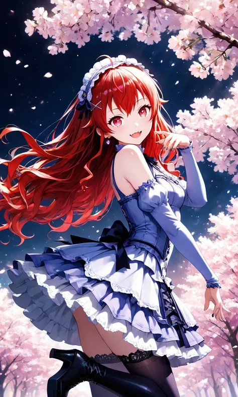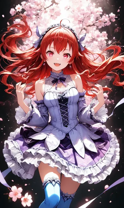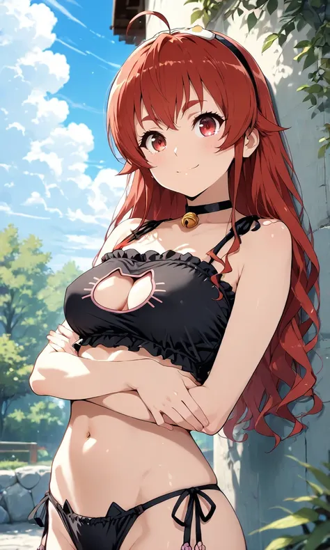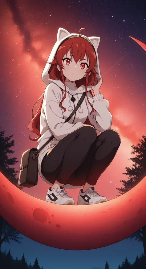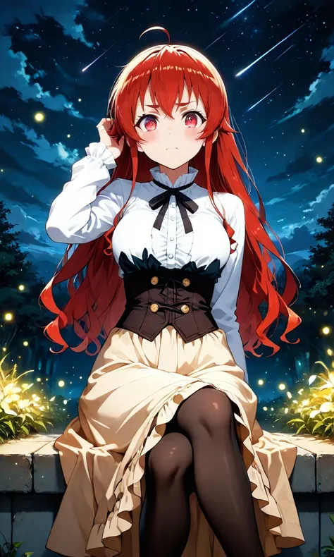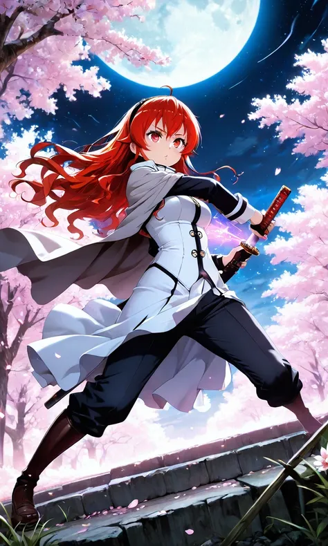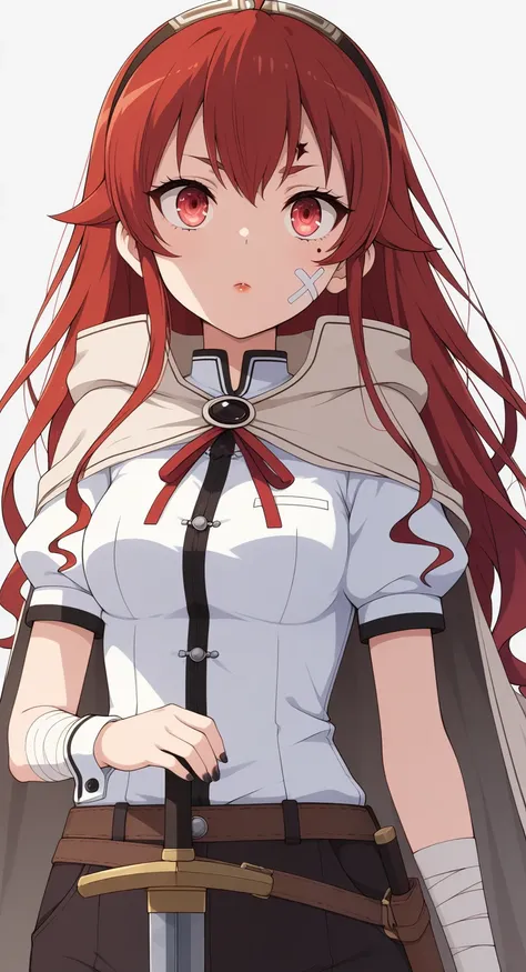 Eris_B0reas, red hair, long hair, bangs, red eyes, ahoge, hairband, high gradient eyes, jacket, gray cape, white dress, black pants, long pants