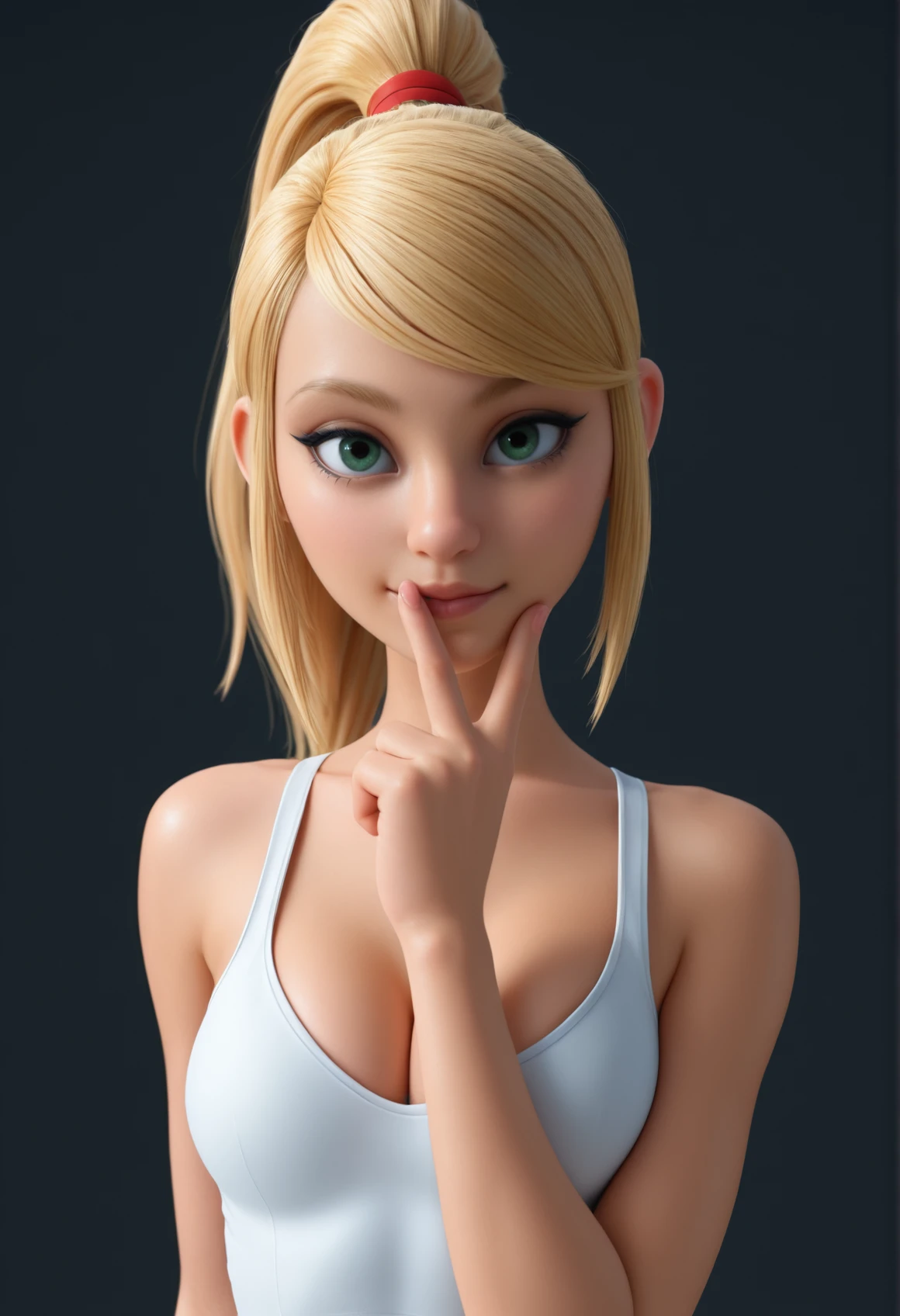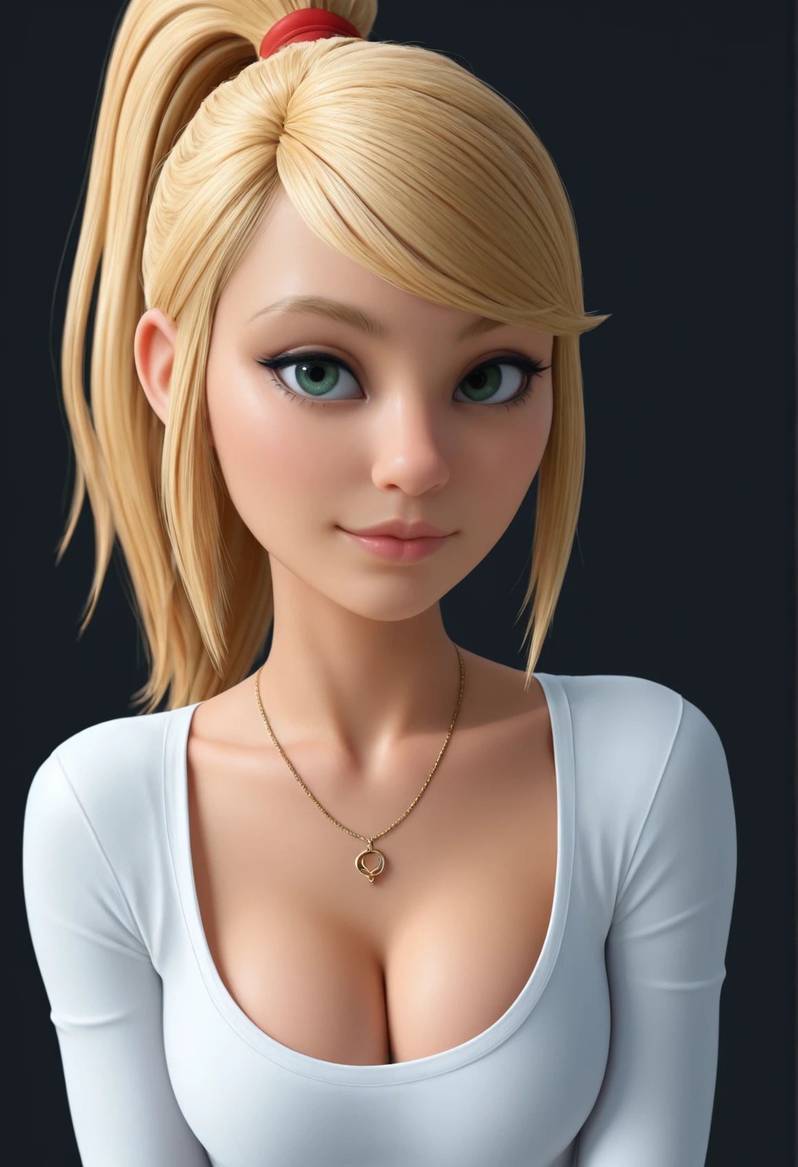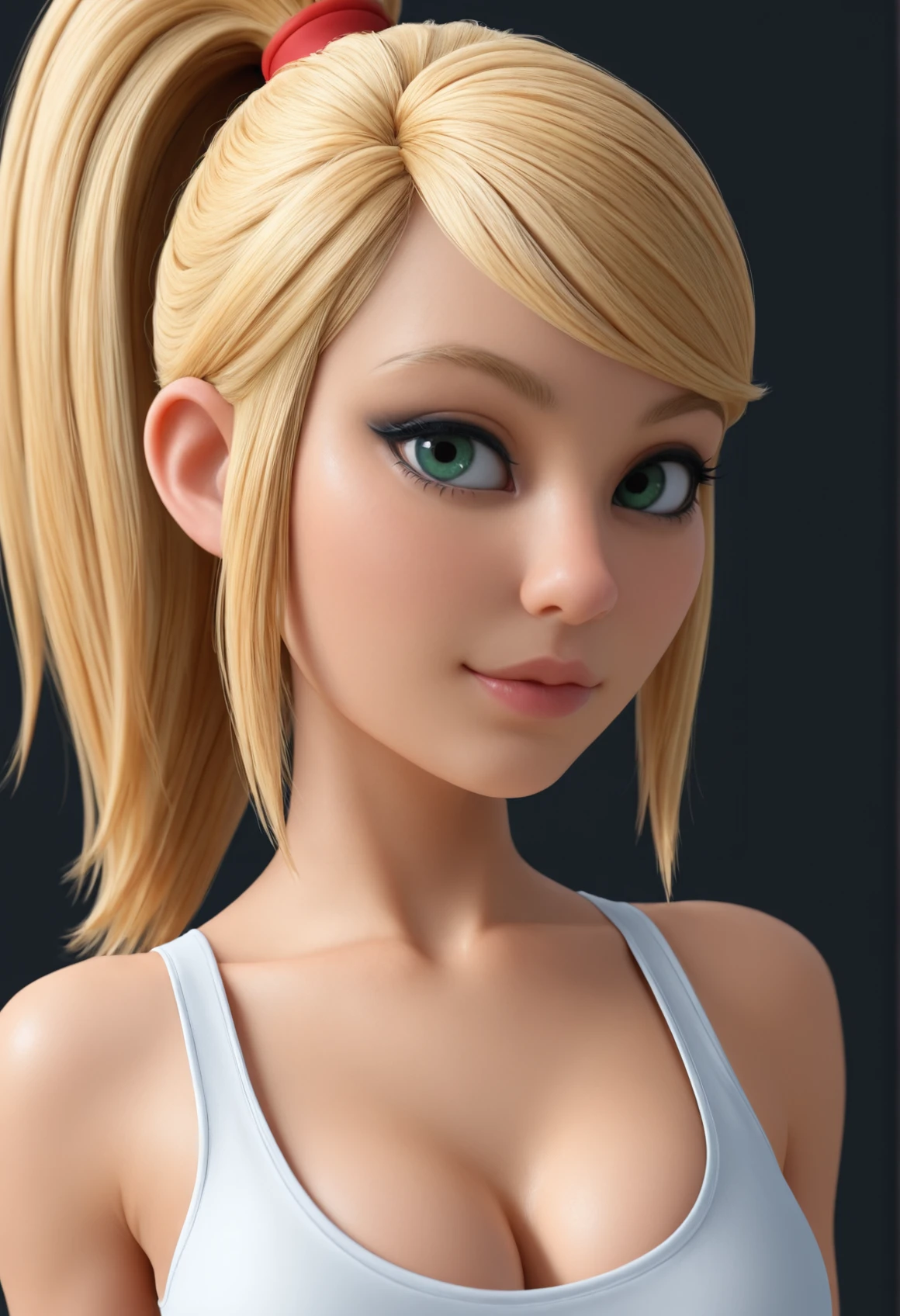 V3r4Cute, green eyes, blonde hair, ponytail, long hair