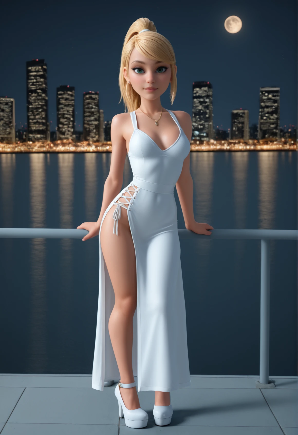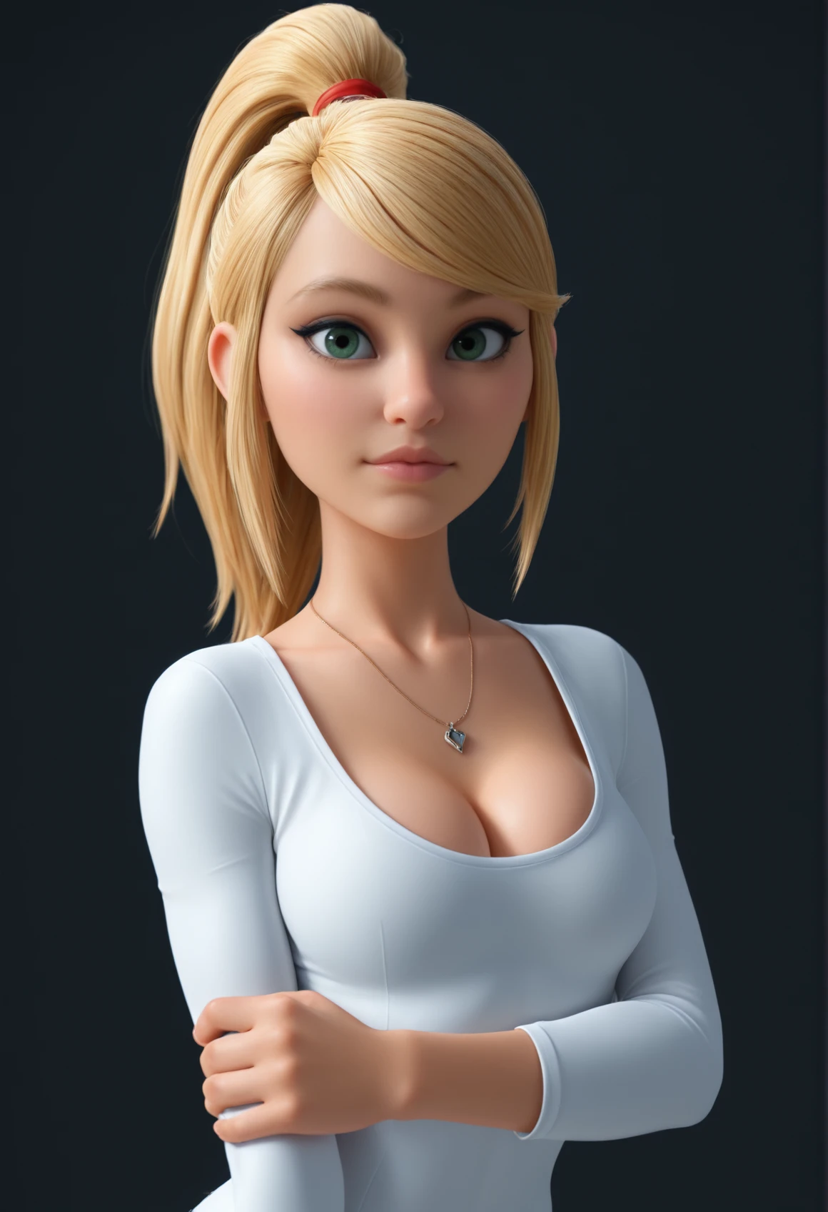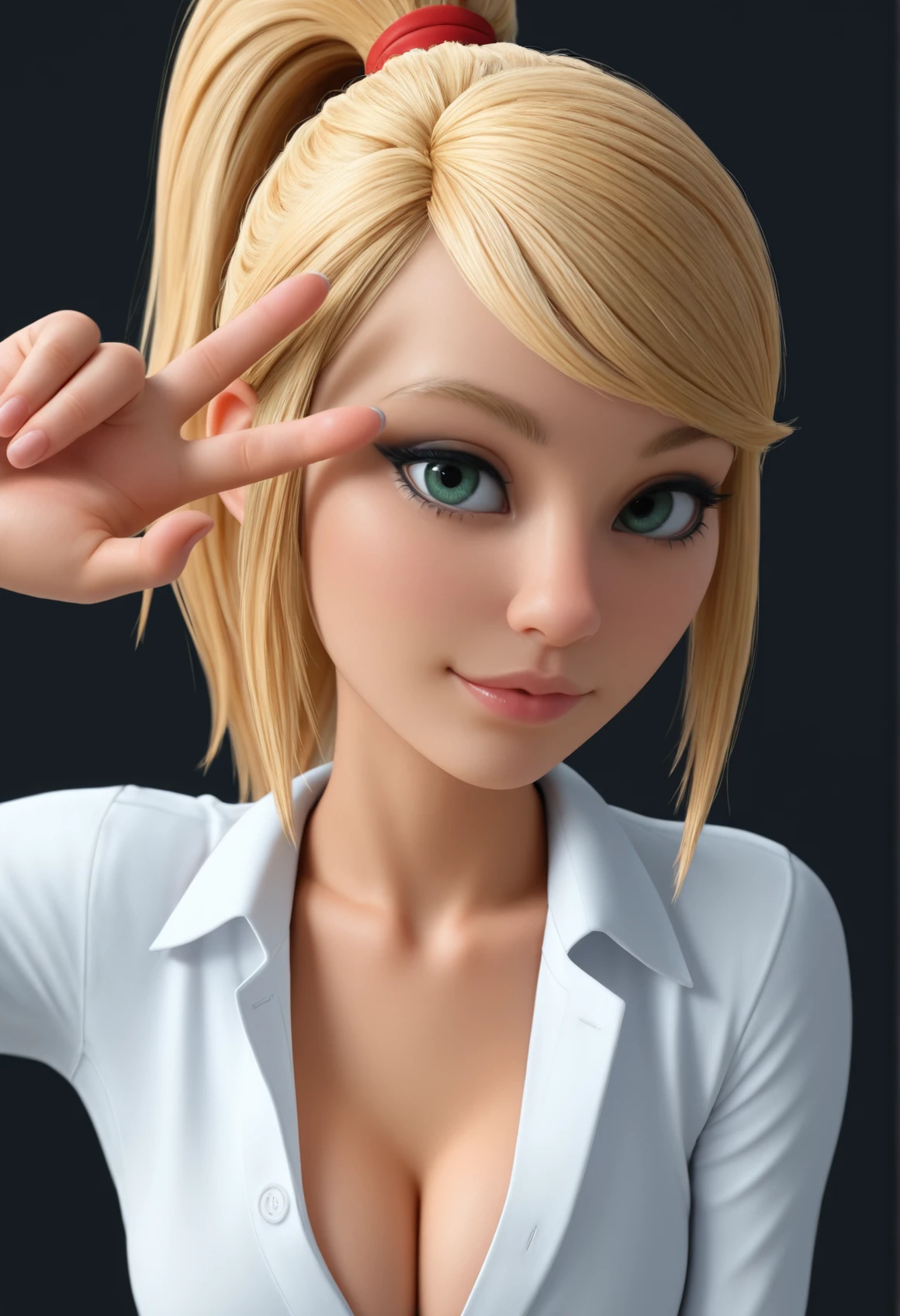 V3r4Cute, green eyes, blonde hair, ponytail, long hair