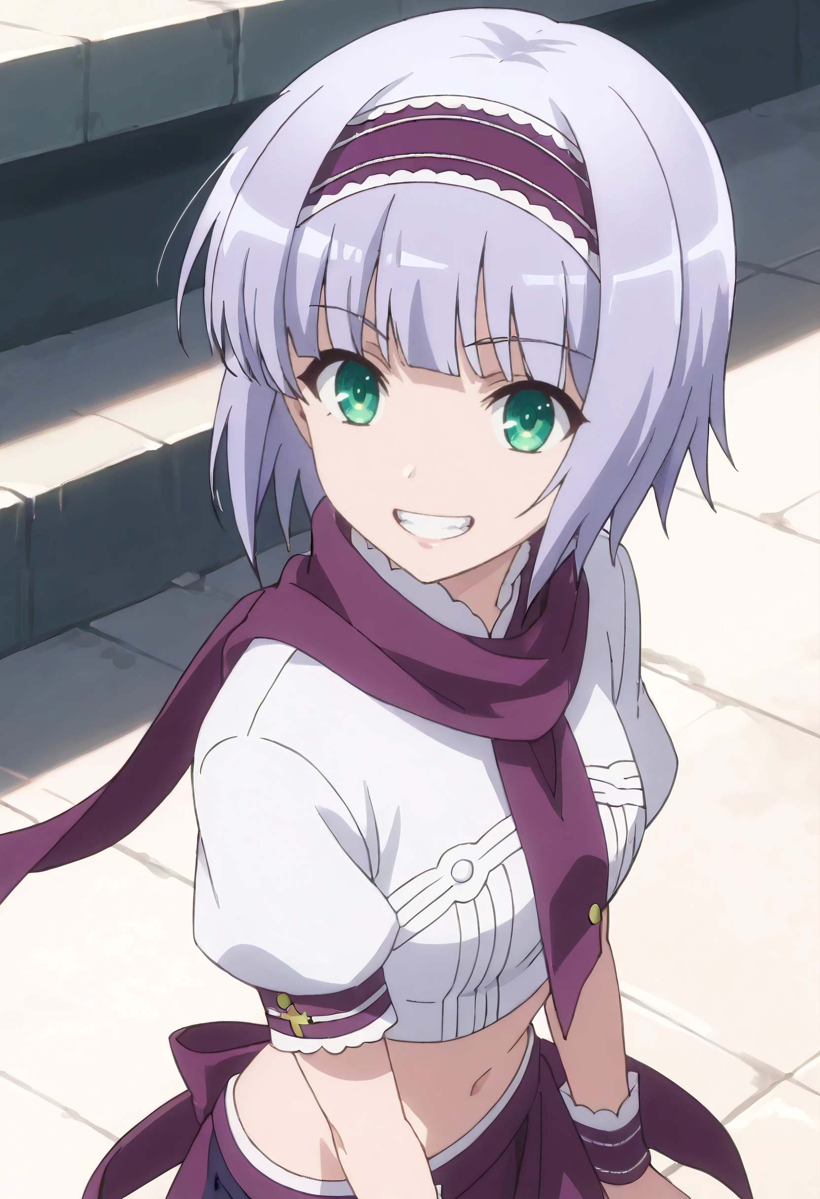 IAWLinze, short hair, green eyes, blunt bangs, purple hair, pink hairband, red hairband,