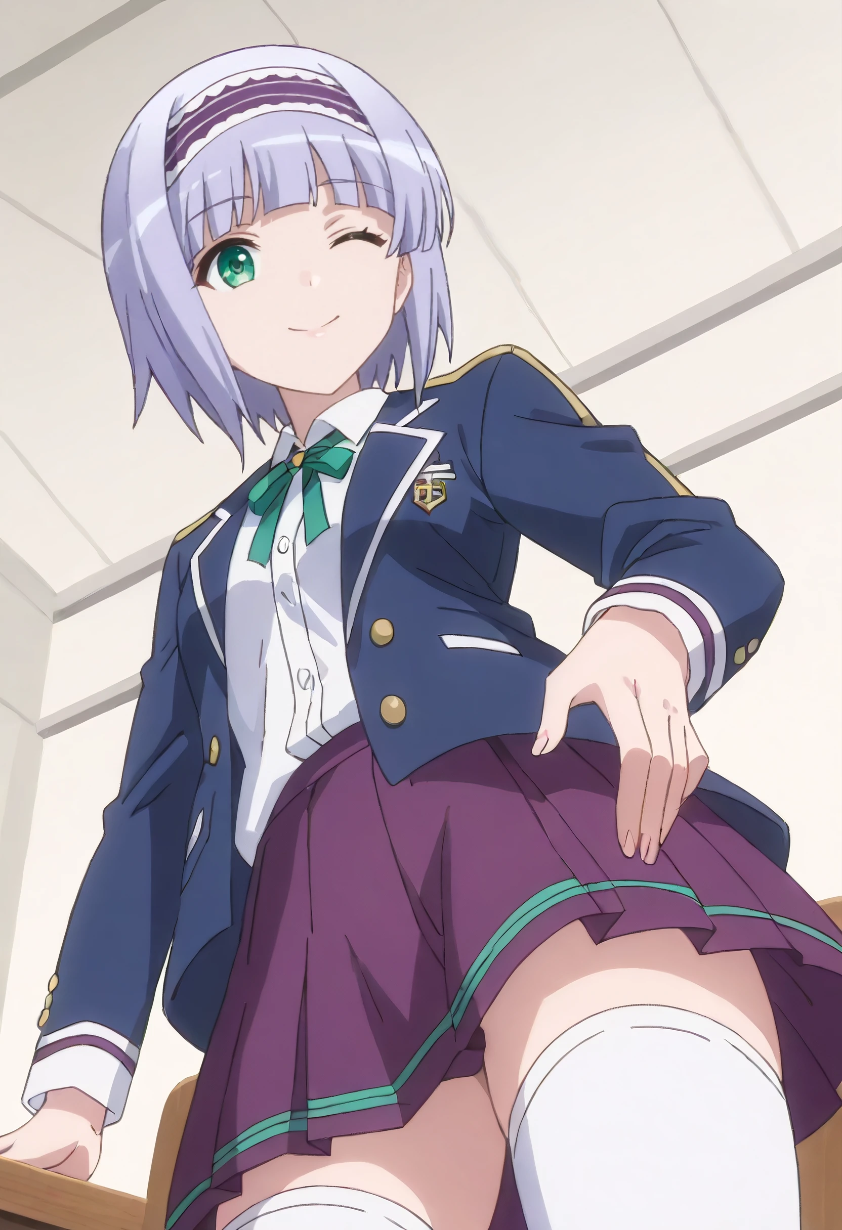 LinzeJacket, shirt, jacket, long sleeves, school uniform, hairband, white shirt, blue jacket, ribbon, green ribbon, neck ribbon, , skirt, pink skirt, collared shirt, , pleated skirt, miniskirt, thighhighs,