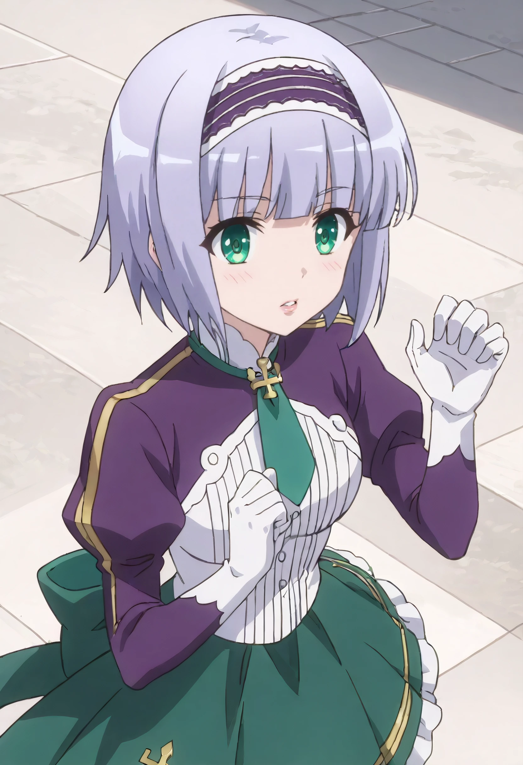 LinzeOutfit, hairband, puffy sleeves, long sleeves, juliet sleeves, necktie, dress, cross, skirt, purple hairband, green necktie, green skirt, pantyhose, boots, frills, white gloves, purple pantyhose,