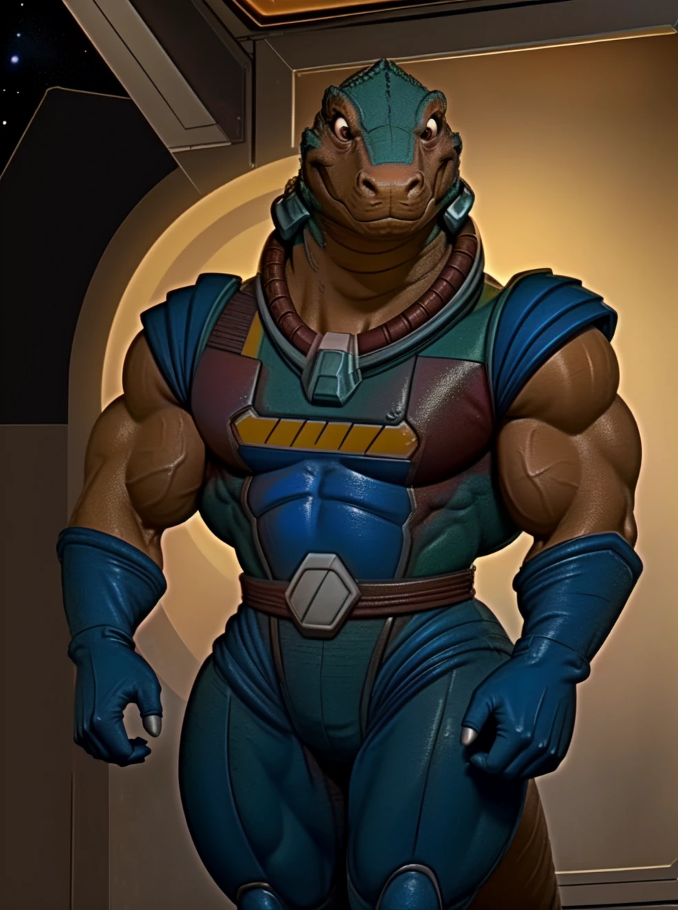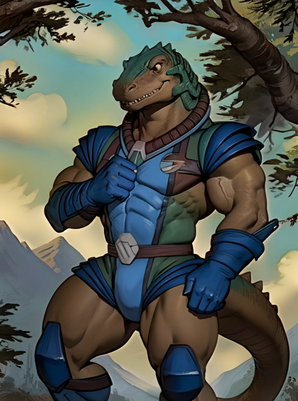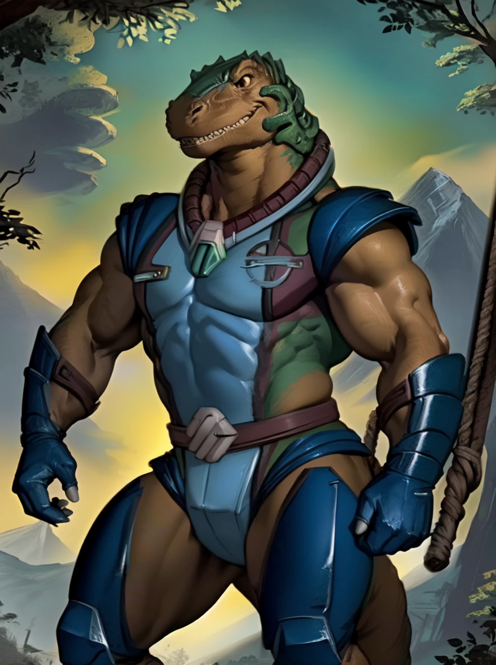 PROMPTS for this model are Allo, Dinosaucers, dinosaur, muscular, armor, chest armor, and brown skin.