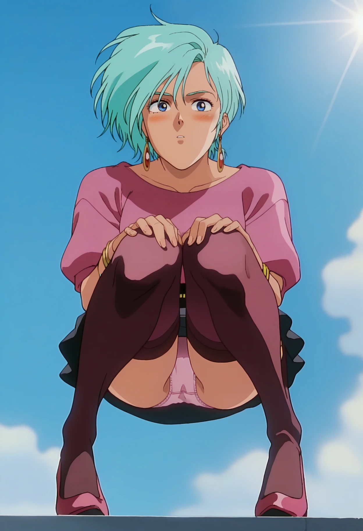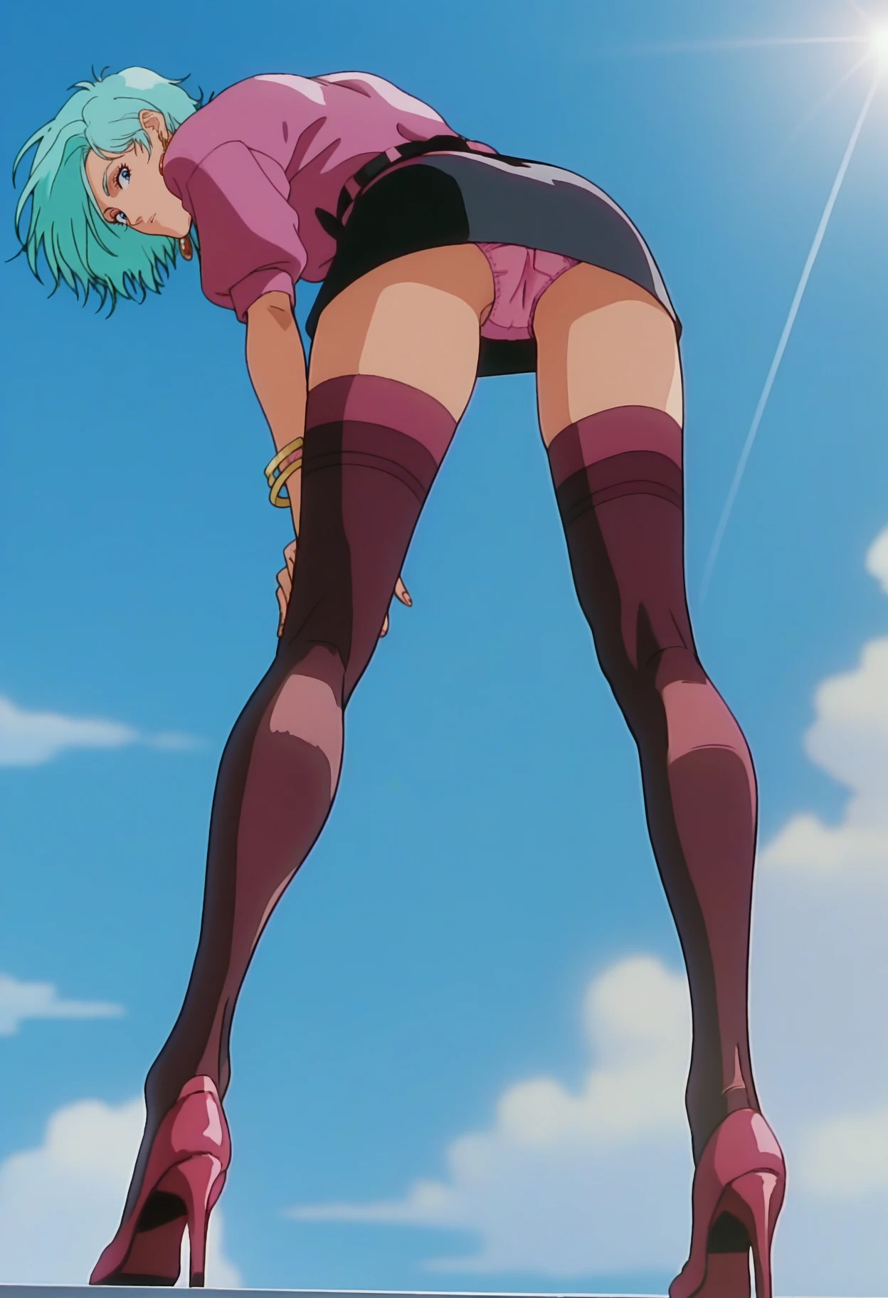 bracelet, pink shirt, belt, black skirt, miniskirt, thighhighs,