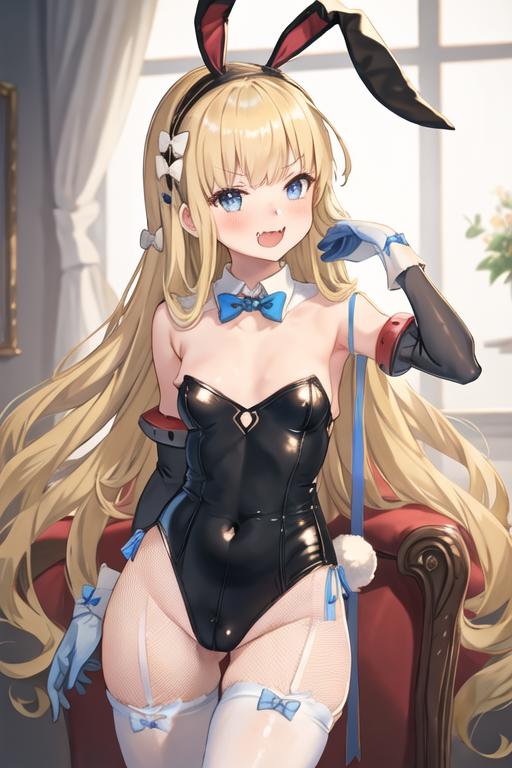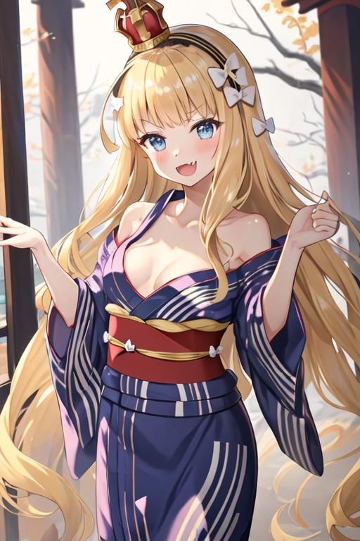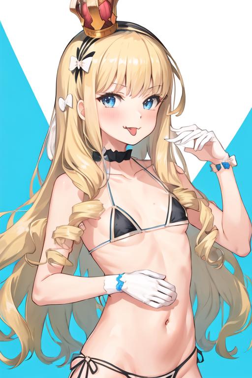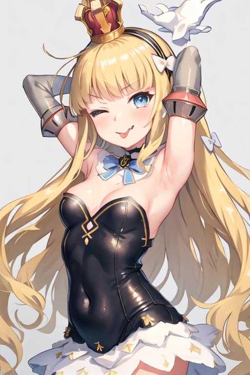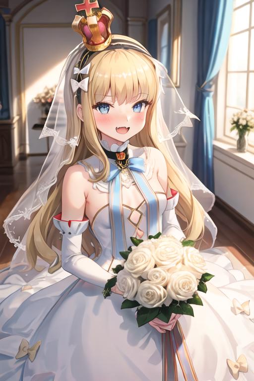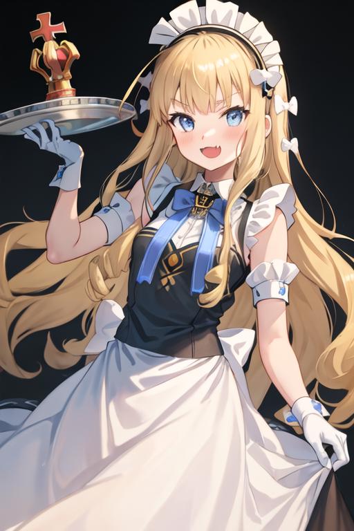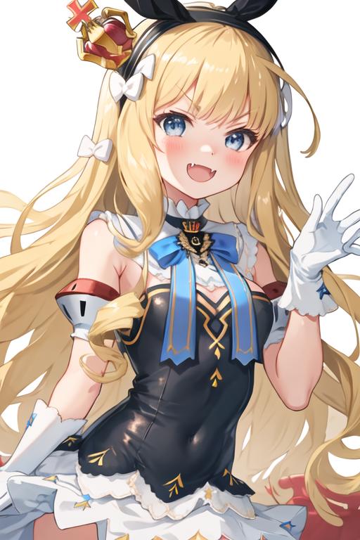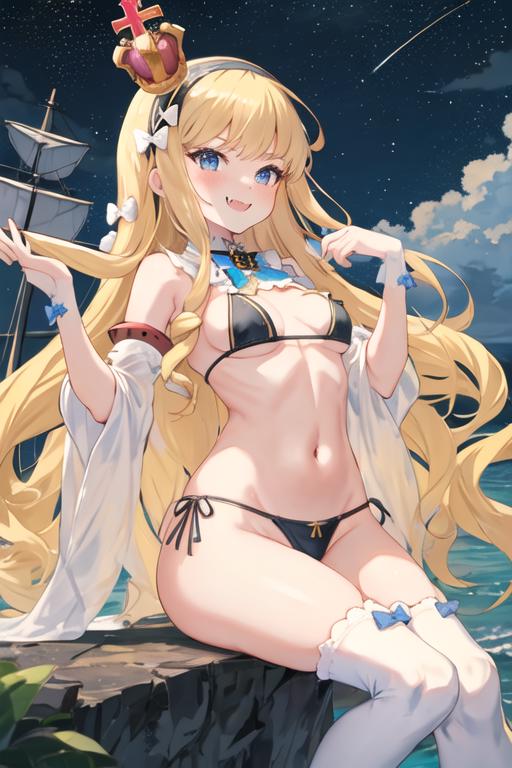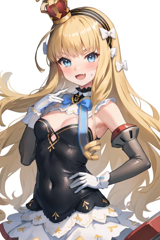 The trigger word is queen_elizabeth_azurlane, and the recommended tags are best quality, masterpiece, highres, solo, {queen_elizabeth_azurlane:1.15}, blonde_hair, long_hair, blue_eyes, crown, hairband, bow, mini_crown, hair_bow, blush, bangs, black_hairband, open_mouth, white_bow, smile, breasts, fang, small_breasts.