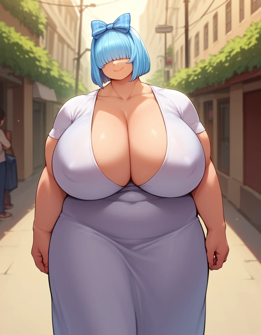 hitome, blue hair, plump, short hair, cyclops,yellow eyes,single horn