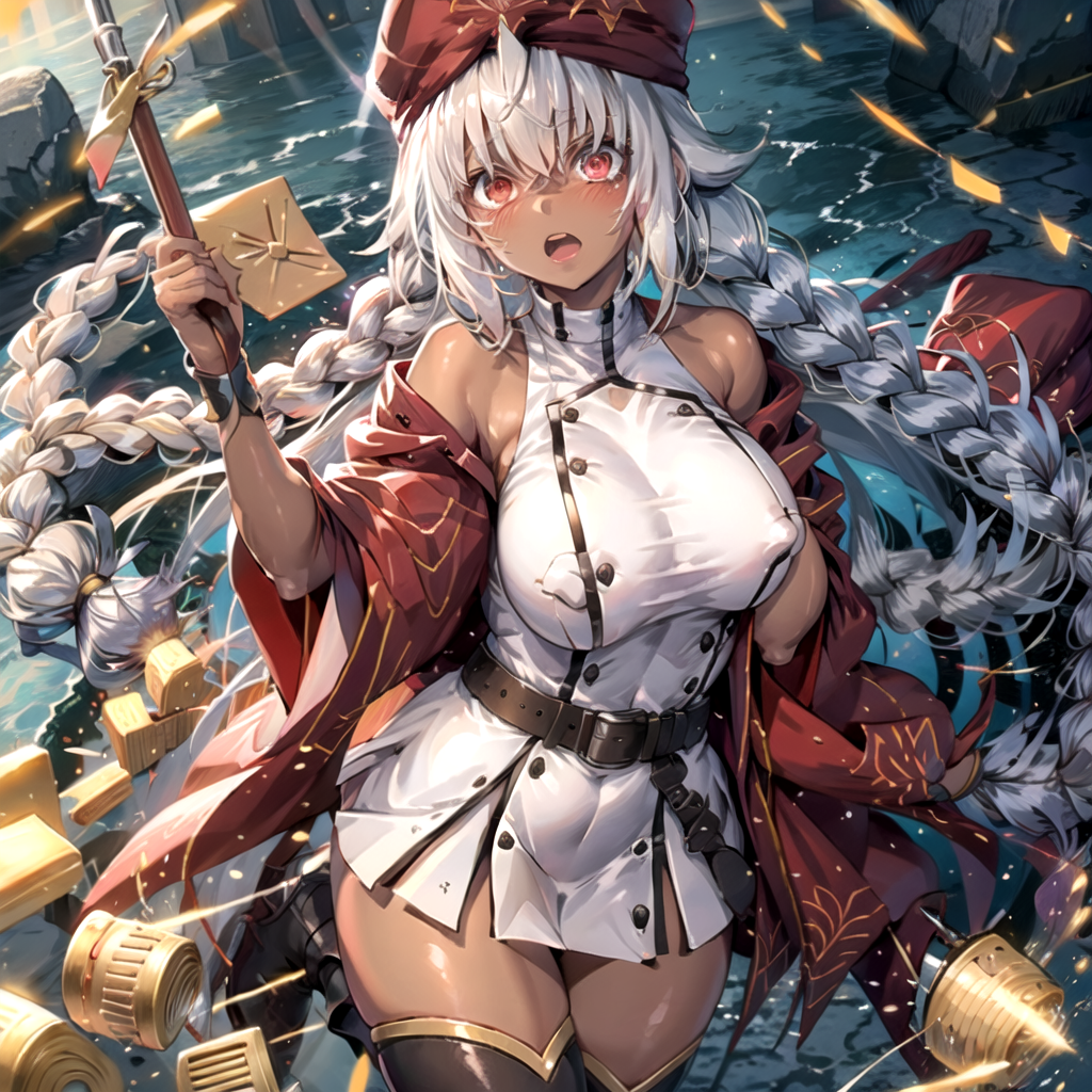 an anime girl has huge braided hair and holds up a letter, 1girl, long hair, dark skin, braid, solo, white hair, dark-skinned female, turban, twin braids, red eyes, very long hair, blush, open mouth, breasts, thighhighs, red headwear,