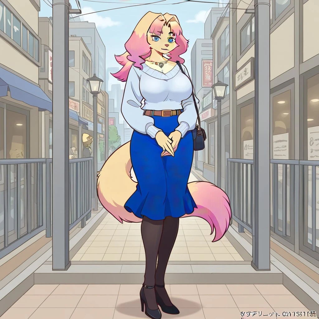 dog, dog girl, tan fur, tan and pink hair, long hair, blue eyes, black nose, tan and pink dog tail, large breasts,