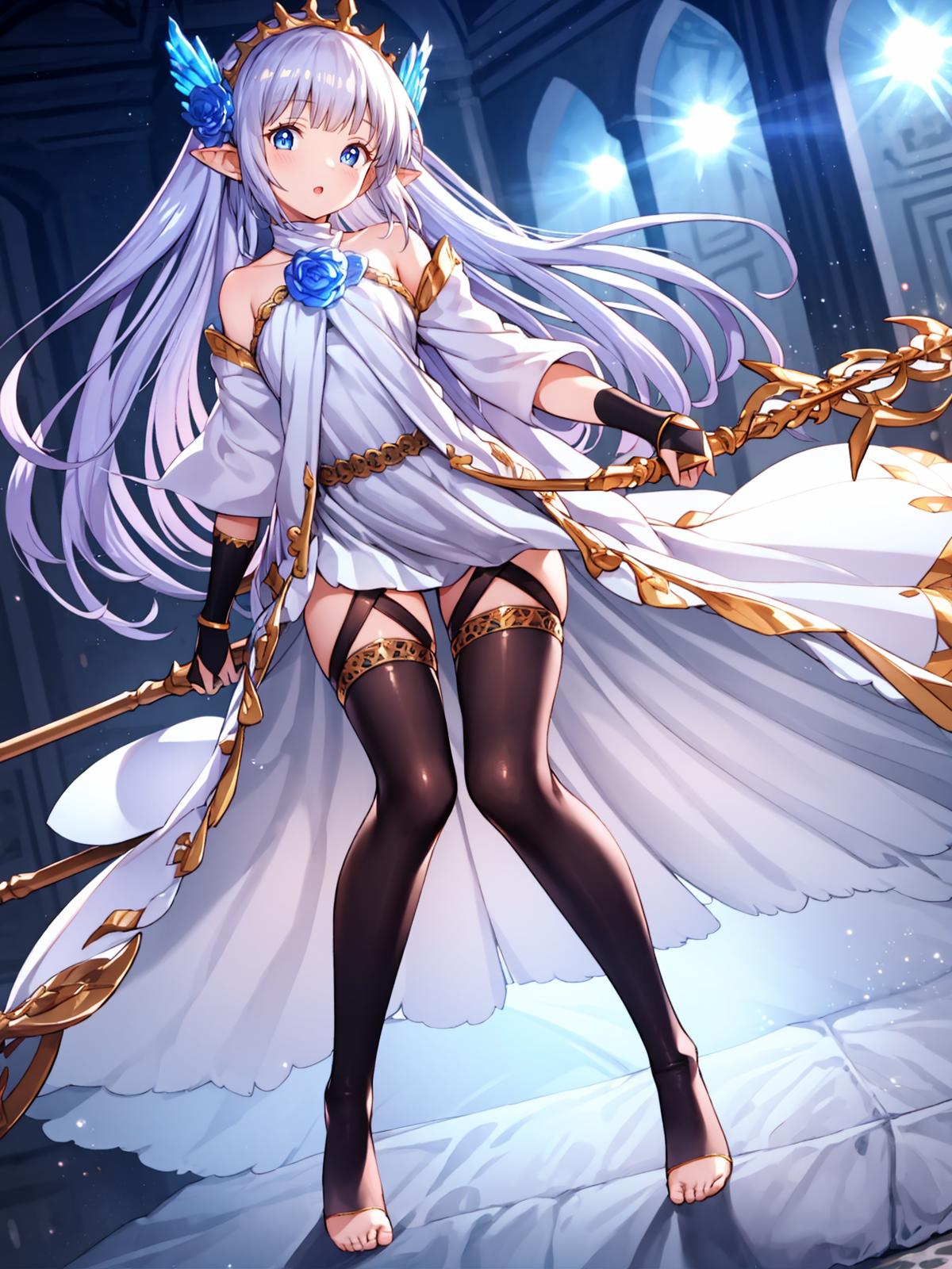 LiLyGrandBlue, very long hair, hair ornament, tiara, blue rose, white dress, toeless legwear, staff, bridal gauntlets,