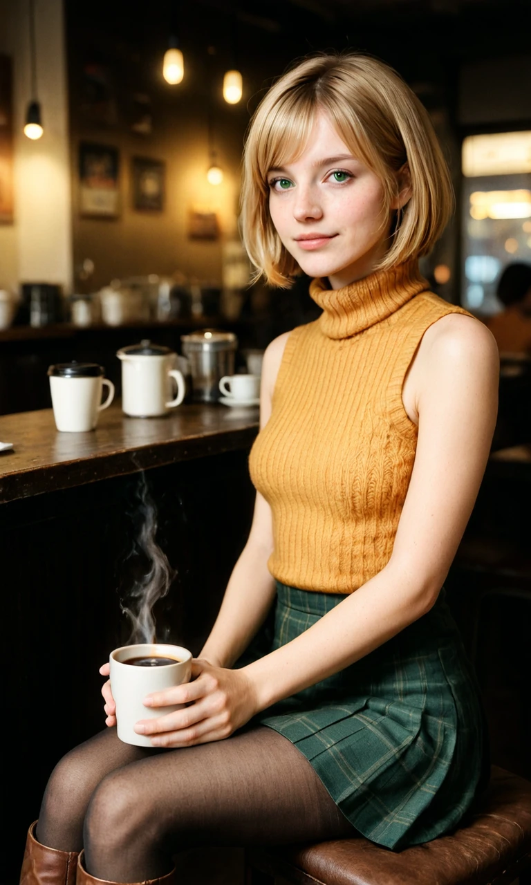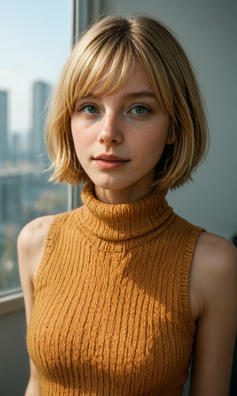 1girl, blonde hair, bob cut, green eyes, turtleneck sweater, orange sleeveless sweater, green skirt