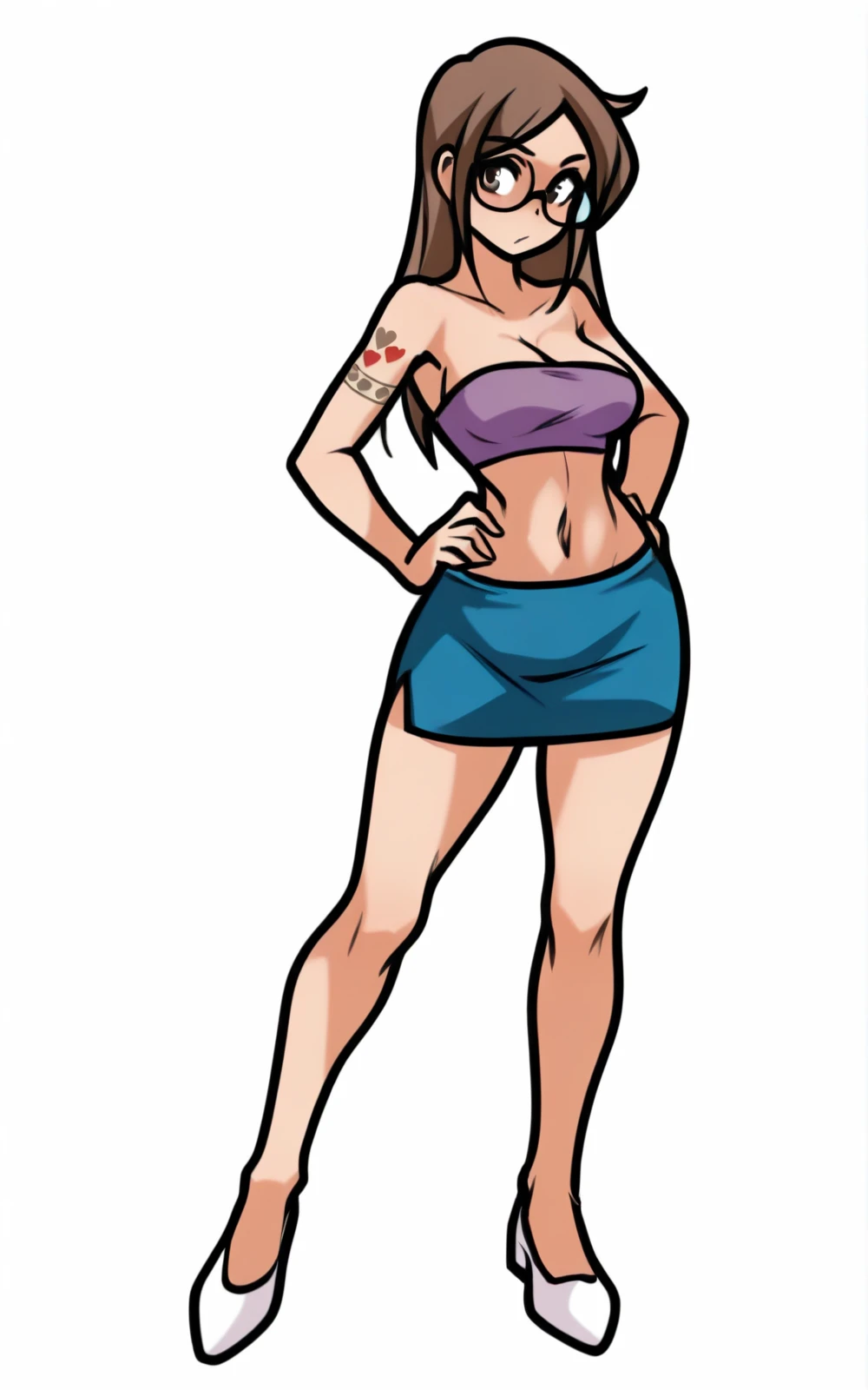 For her Outfit: skirt, glasses, midriff, cleavage, miniskirt, blue skirt, shoes, white shoes, bandeau, purple bandeau
