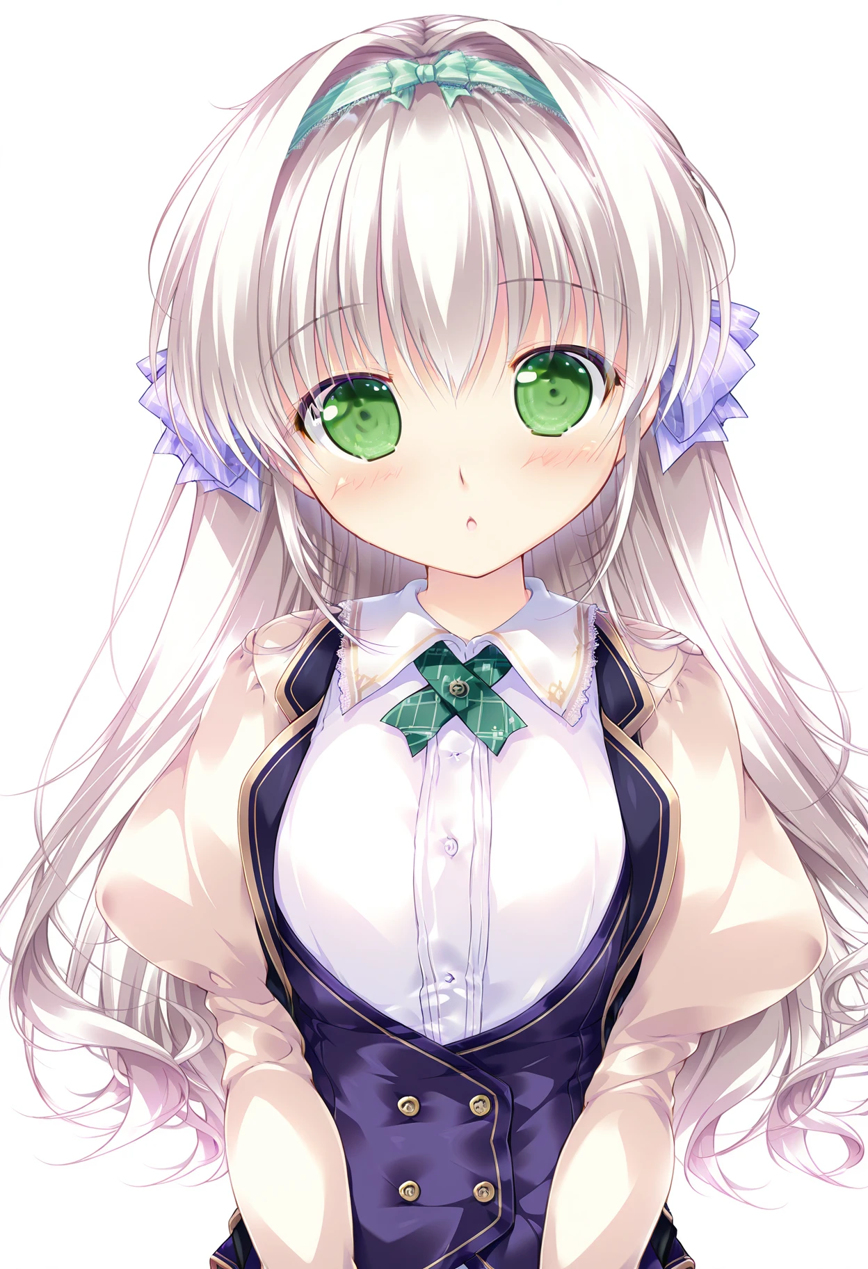 belleage pozon, mikeou style,green eyes,white hair,very long hair,long hair,hair intakes,hair between eyes,green hairband, bow hairband, purple hair bow,hair bow,school uniform,white shirt,frills,long sleeves,puffy sleeves,juliet sleeves,white thighhighs,ribbon trim thighhighs,