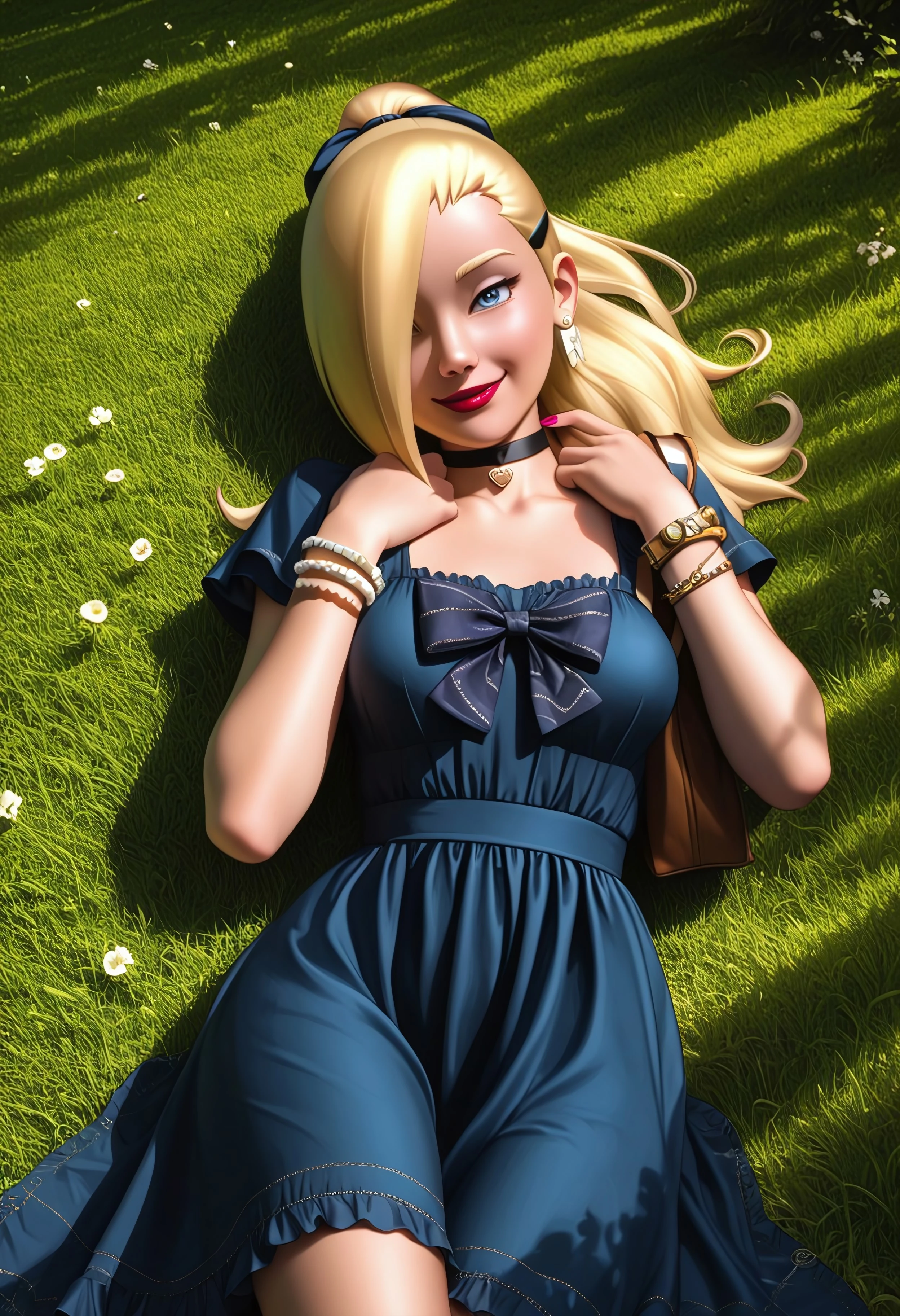1girl, solo, 1n0Y4m4URQq, blue eyes, blonde hair, ponytail, hairclip, lipstick, choker, long hair, makeup, hair over one eye, lips, hair ornament
