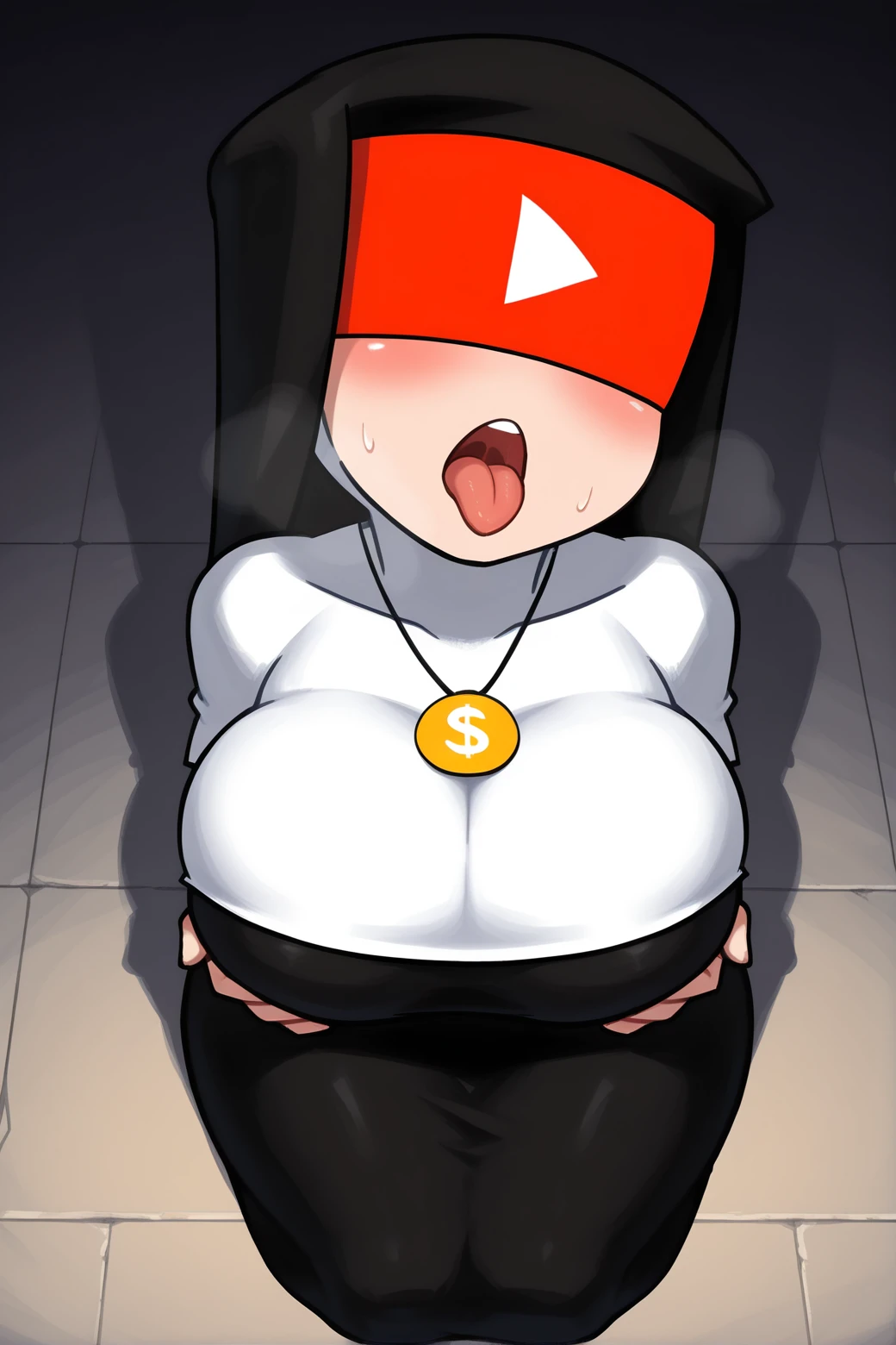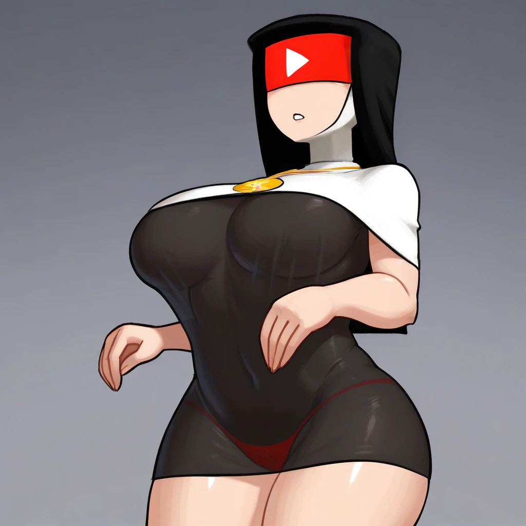 YT_T4N, flat colors, solo, female, human, white skin, eyeless, huge breasts, wide hips, curvy figure, red blindfold, pendant, dollar sign, nun, nun outfit, nun habit, habit,