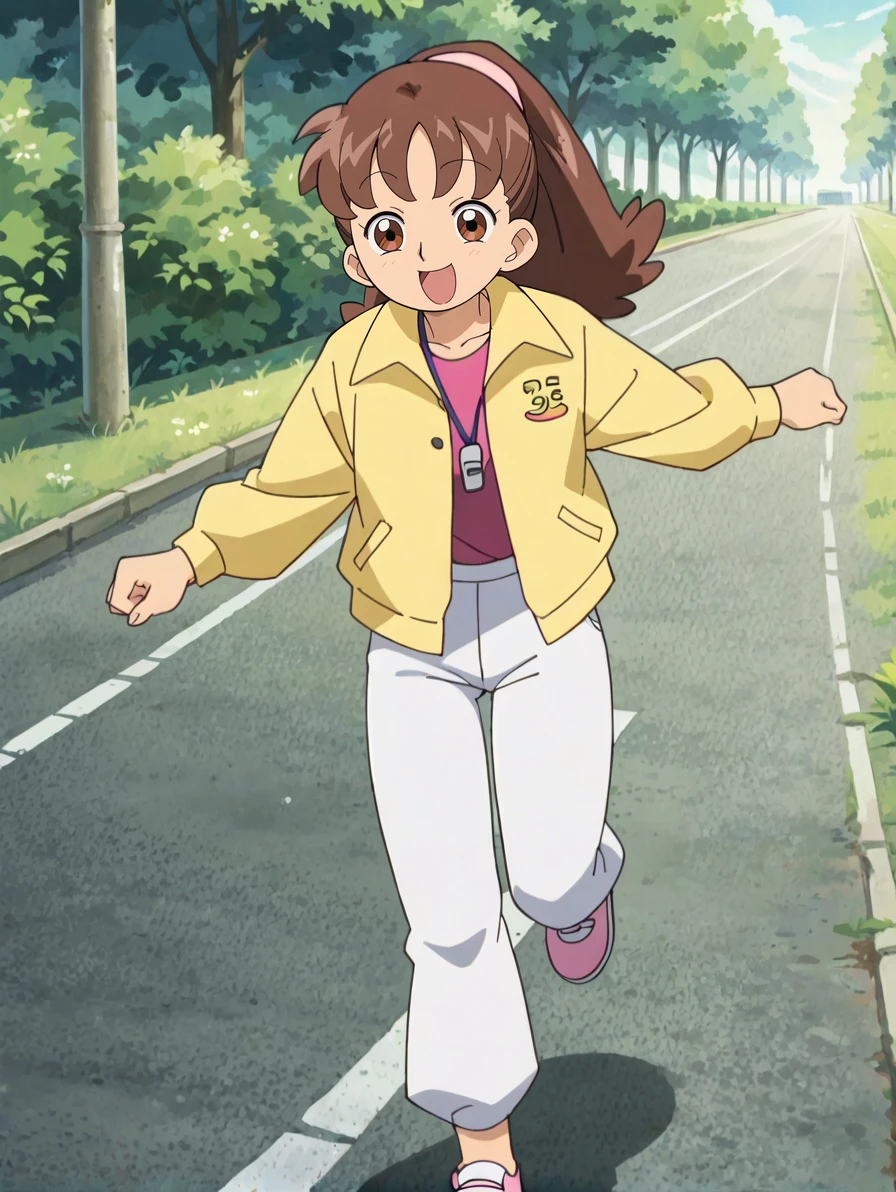 nishizawat, brown hair, long hair, ponytail, hairband,yellow jacket,white pants