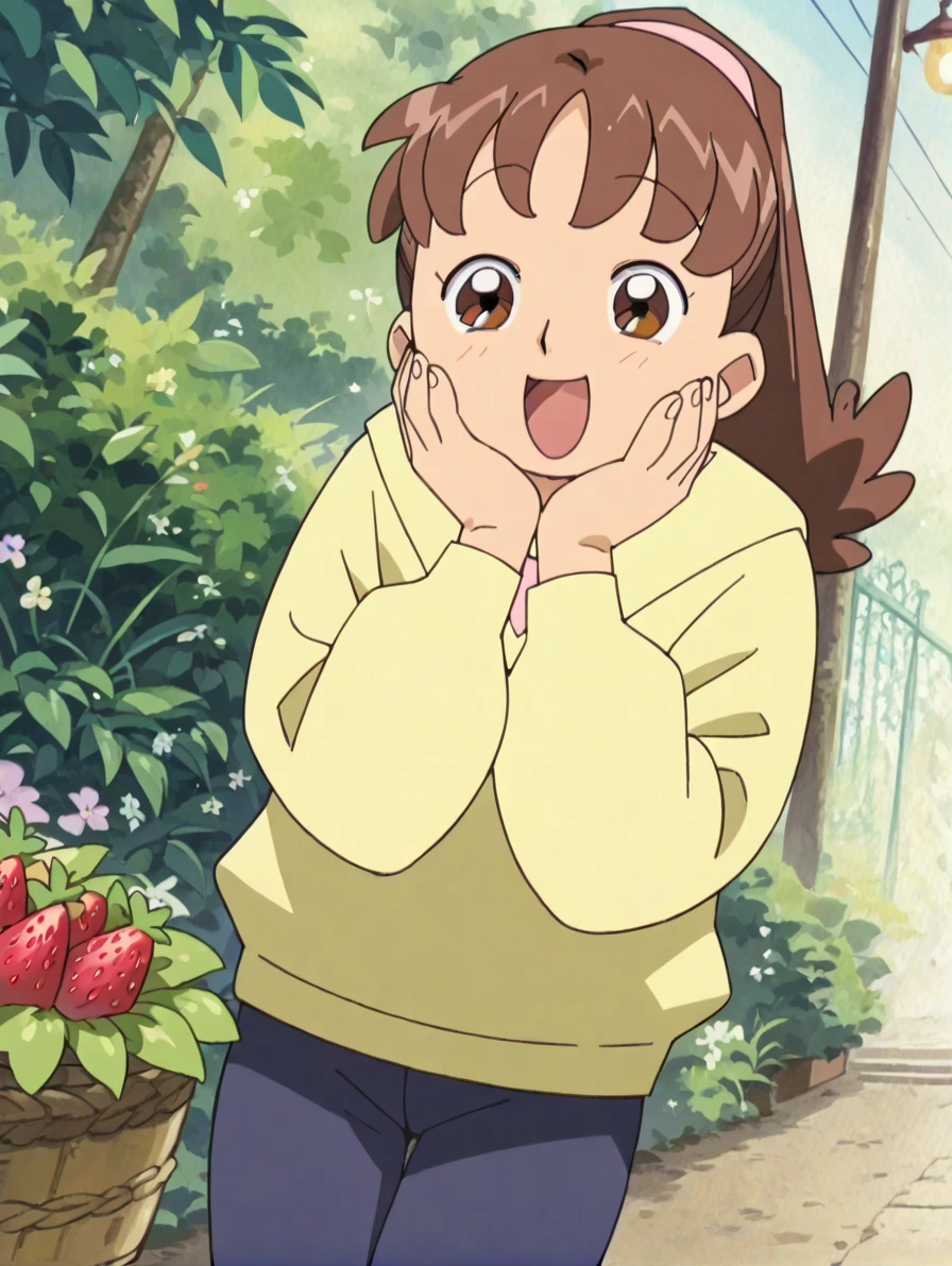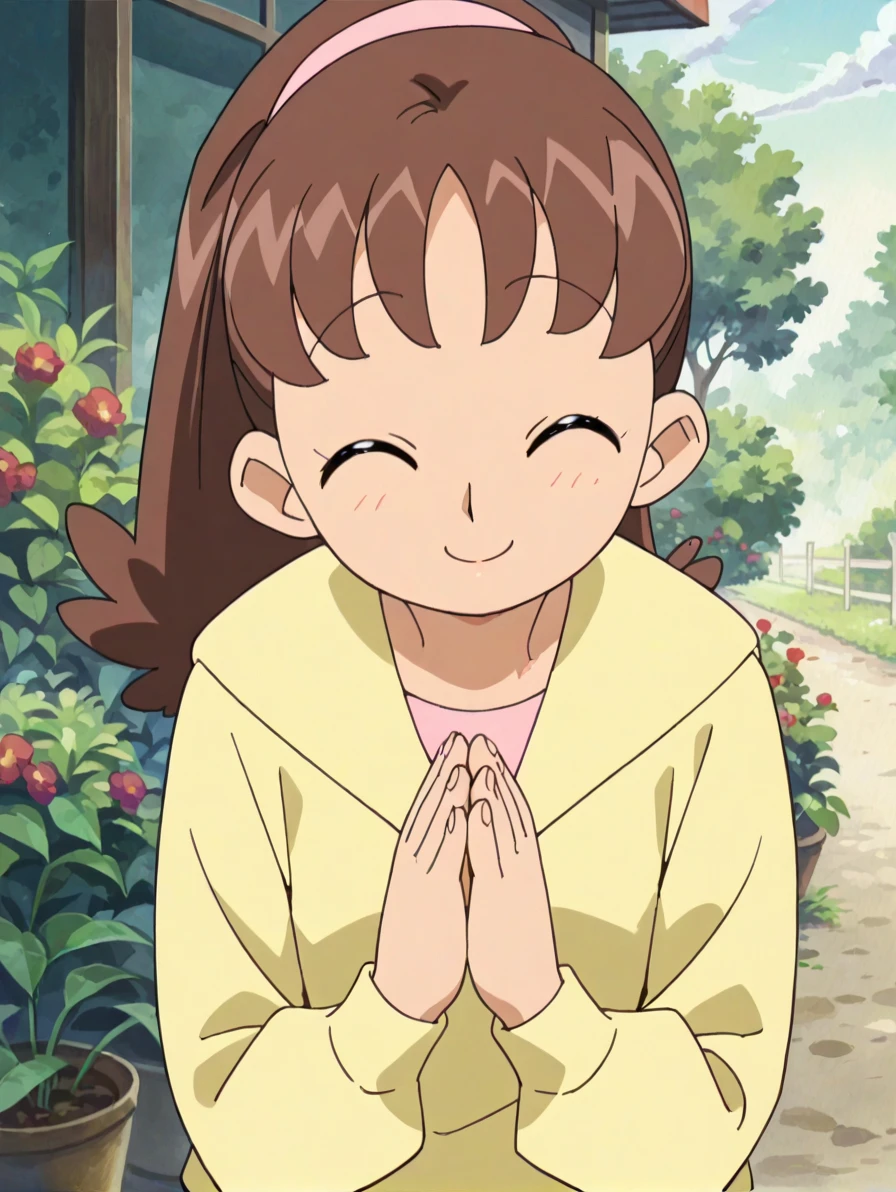 Trigger word: nishizawat, brown hair, long hair, ponytail, hairband,yellow hoodie, long sleeves