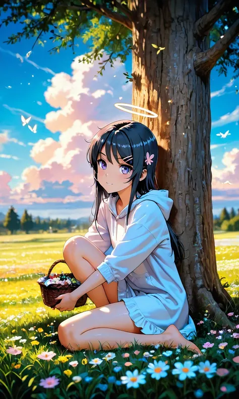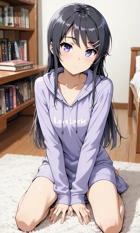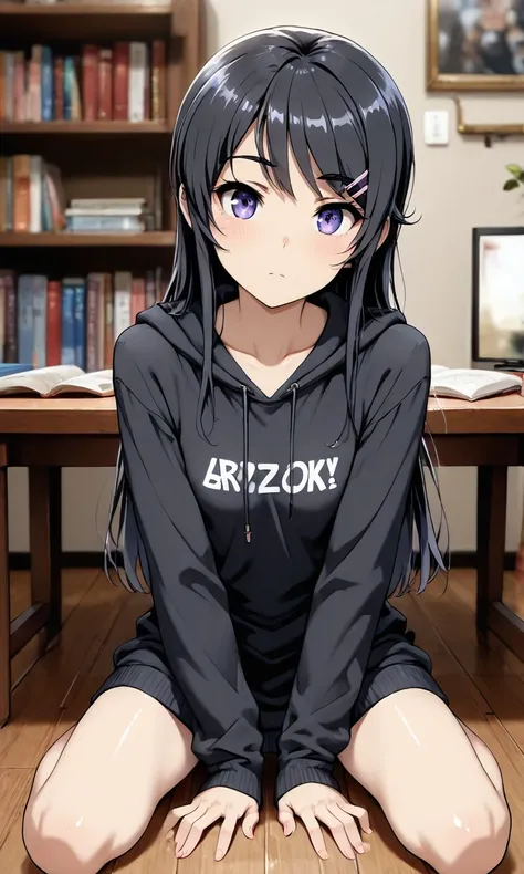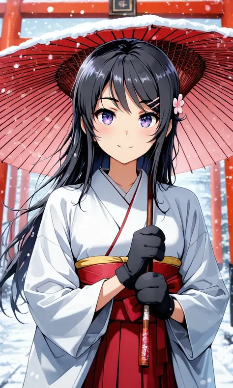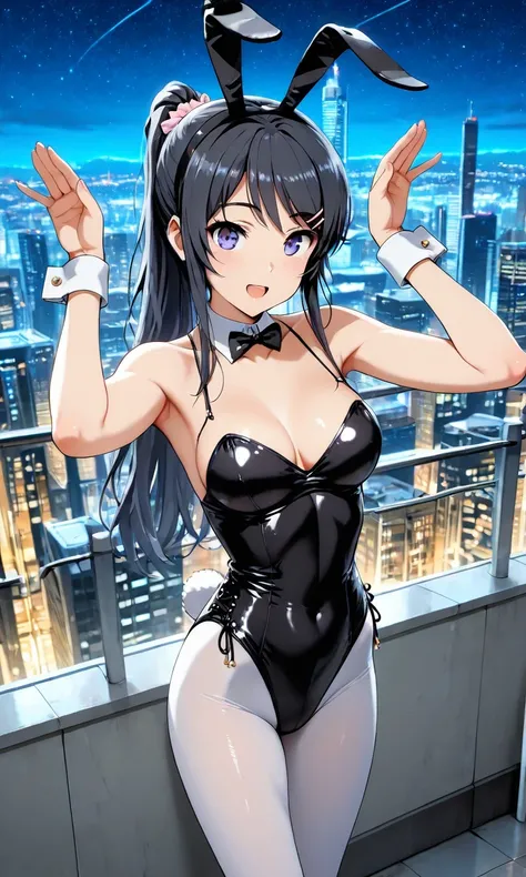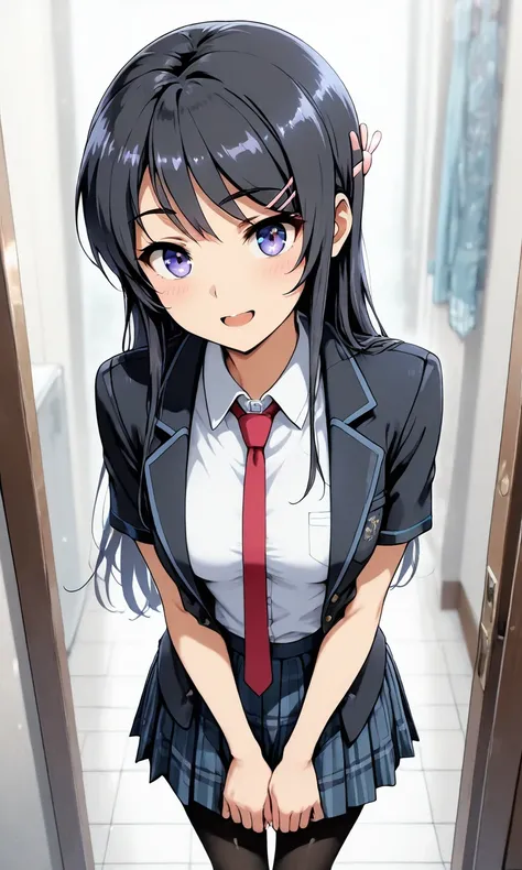 Mai_Sakurajima, long hair, bangs, black_hair, hair_ornament, purple_eyes, hairclip, skirt, shirt, school_uniform, white_shirt, short sleeves, pantyhose, pleated skirt, collared shirt, blue skirt, black pantyhose, red necktie, jacket