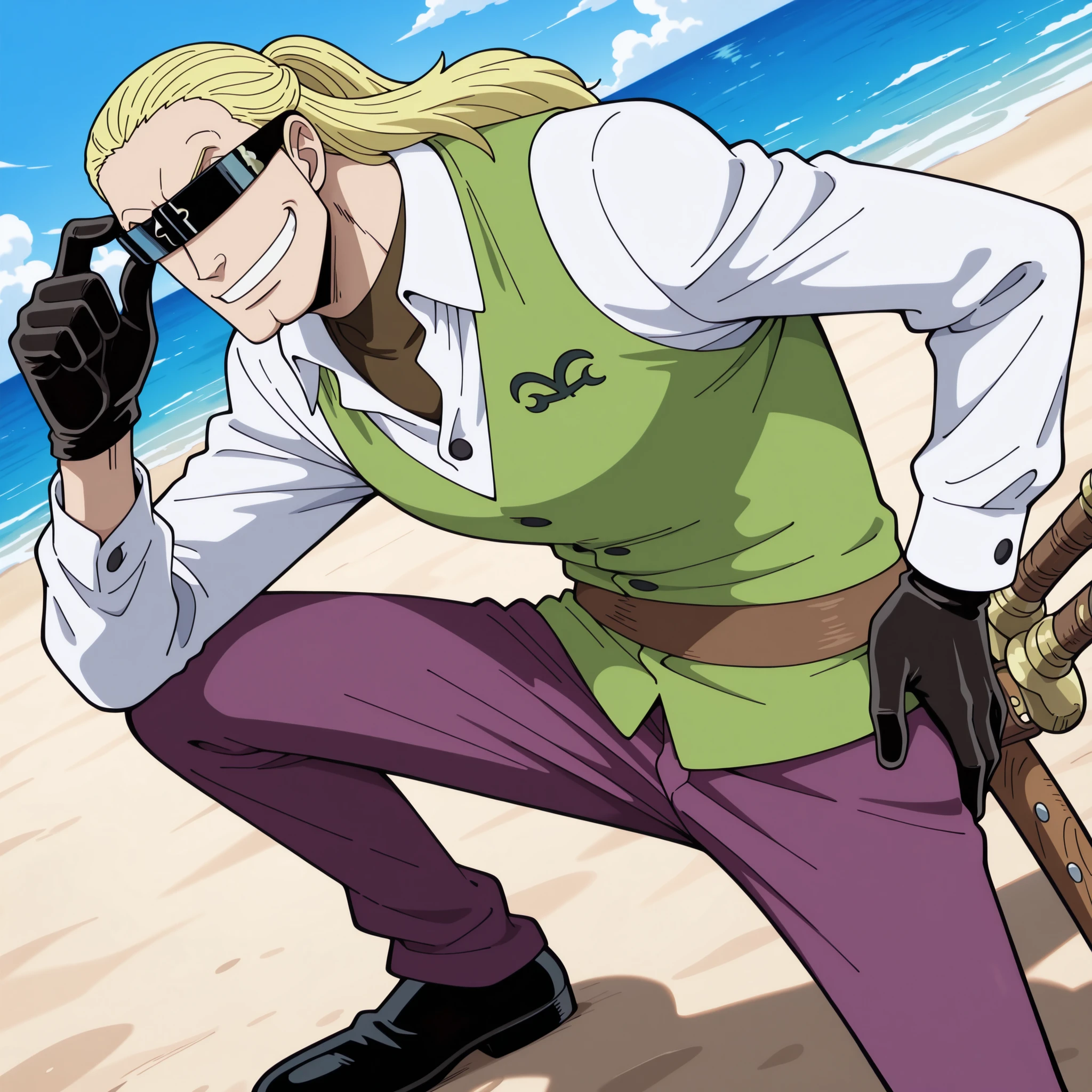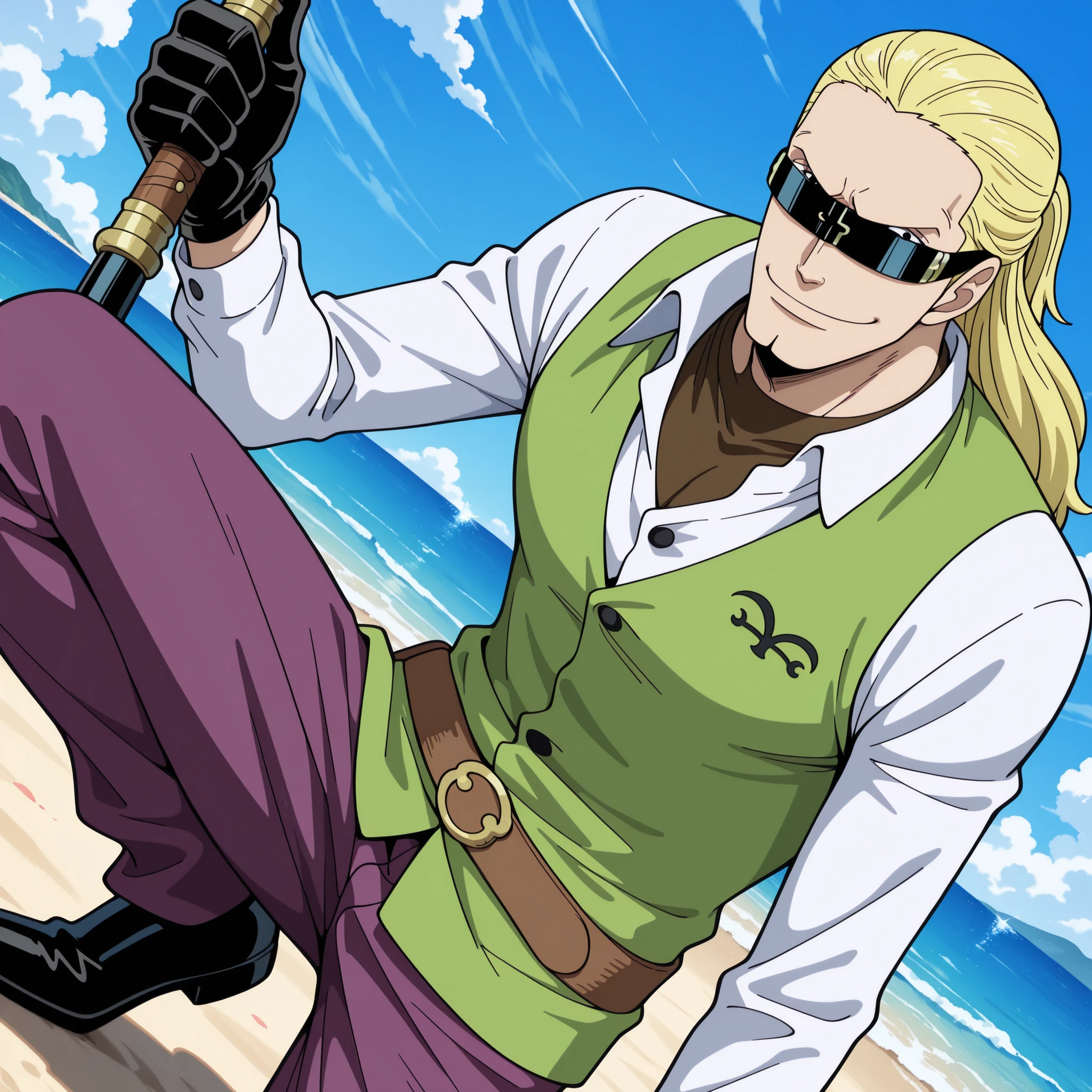 helmeppo, sunglasses, blonde hair, long hair, half updo, collared shirt, long sleeves, green vest, brown shirts, black gloves, weapon, purple pants, black footwear