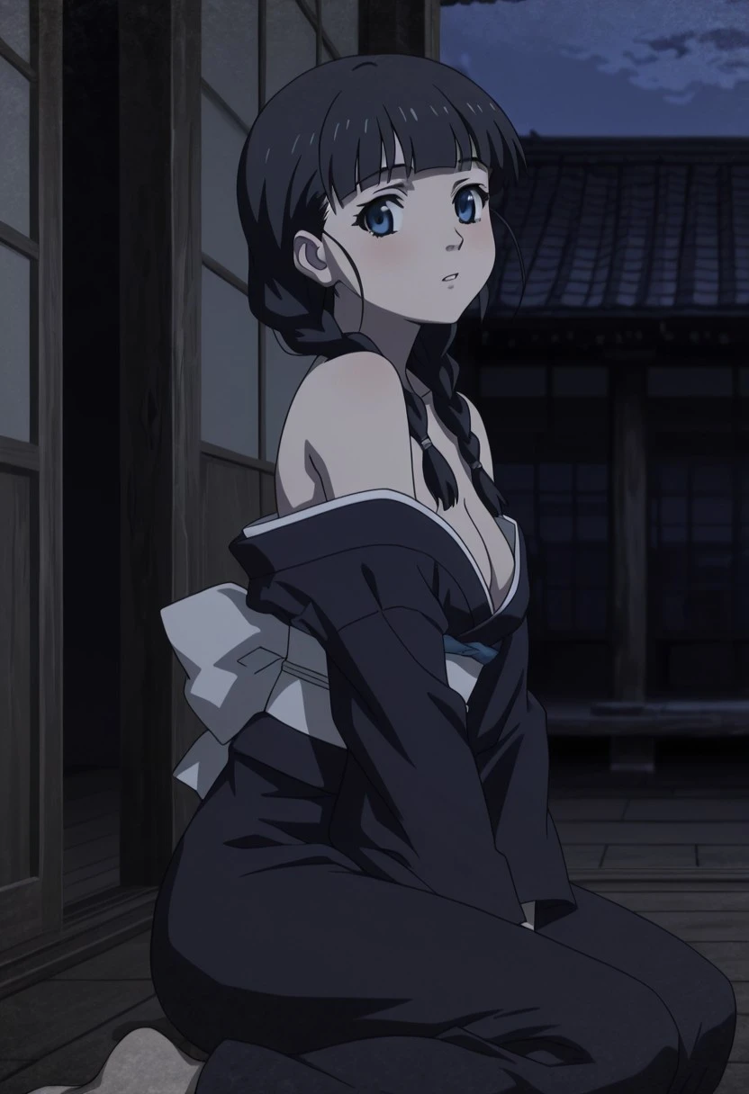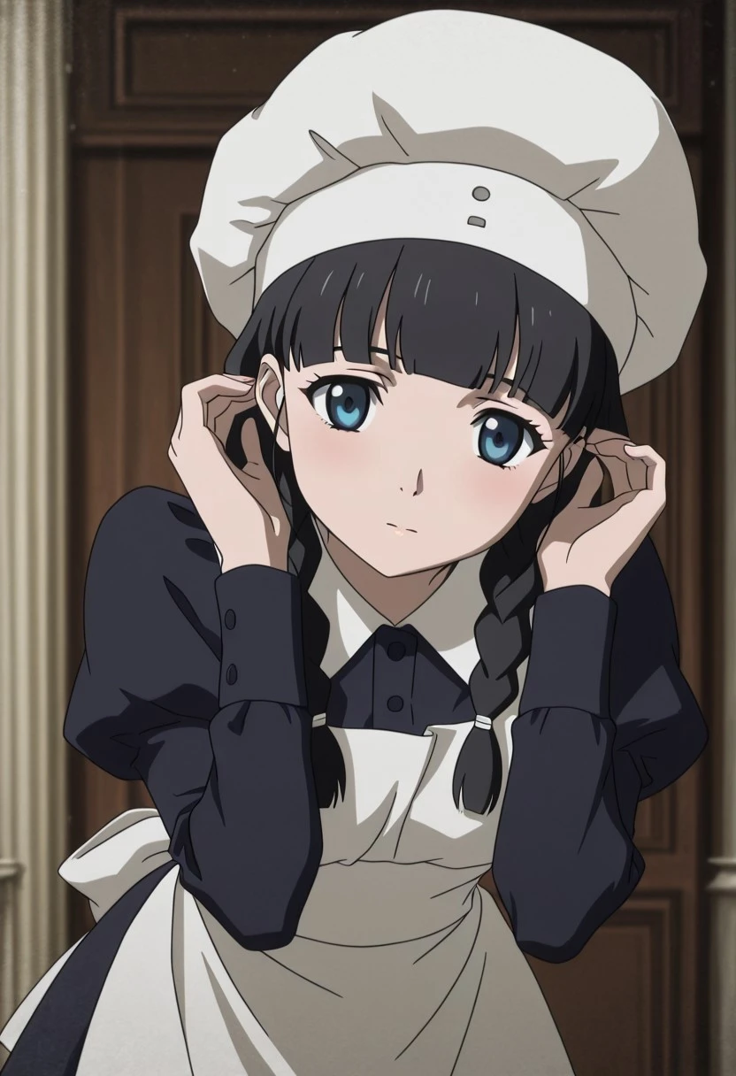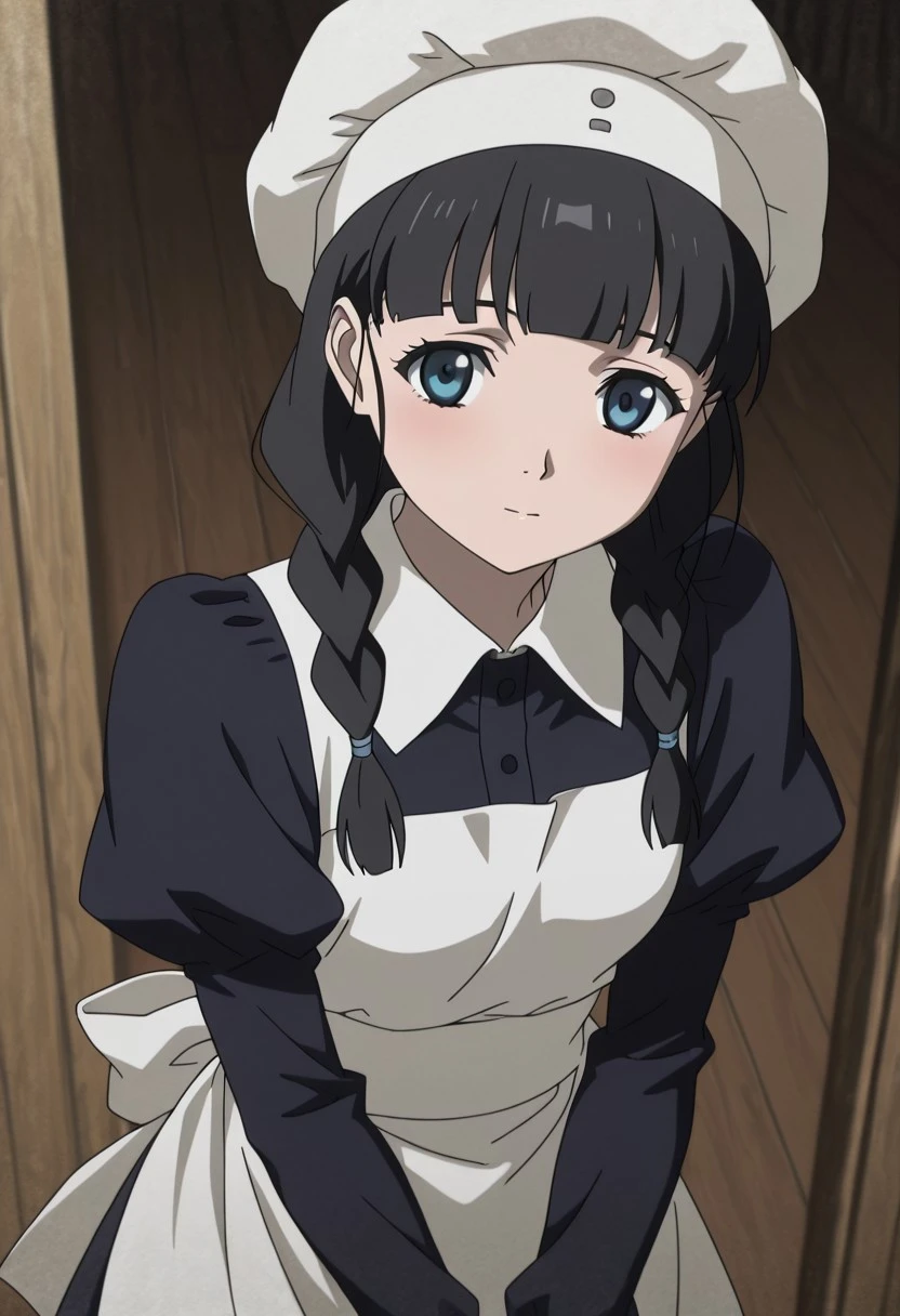 1 girl, solo, Qumola, black hair, two braids, braid hair, blue eyes, hime cut, blunt bangs, white bowtie, maid outfit, white apron, black dress, puffy sleeves, juliet sleeves, long sleeves, white hat