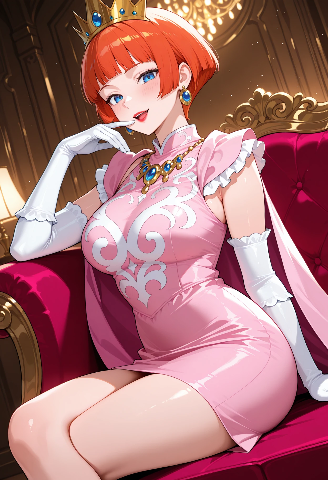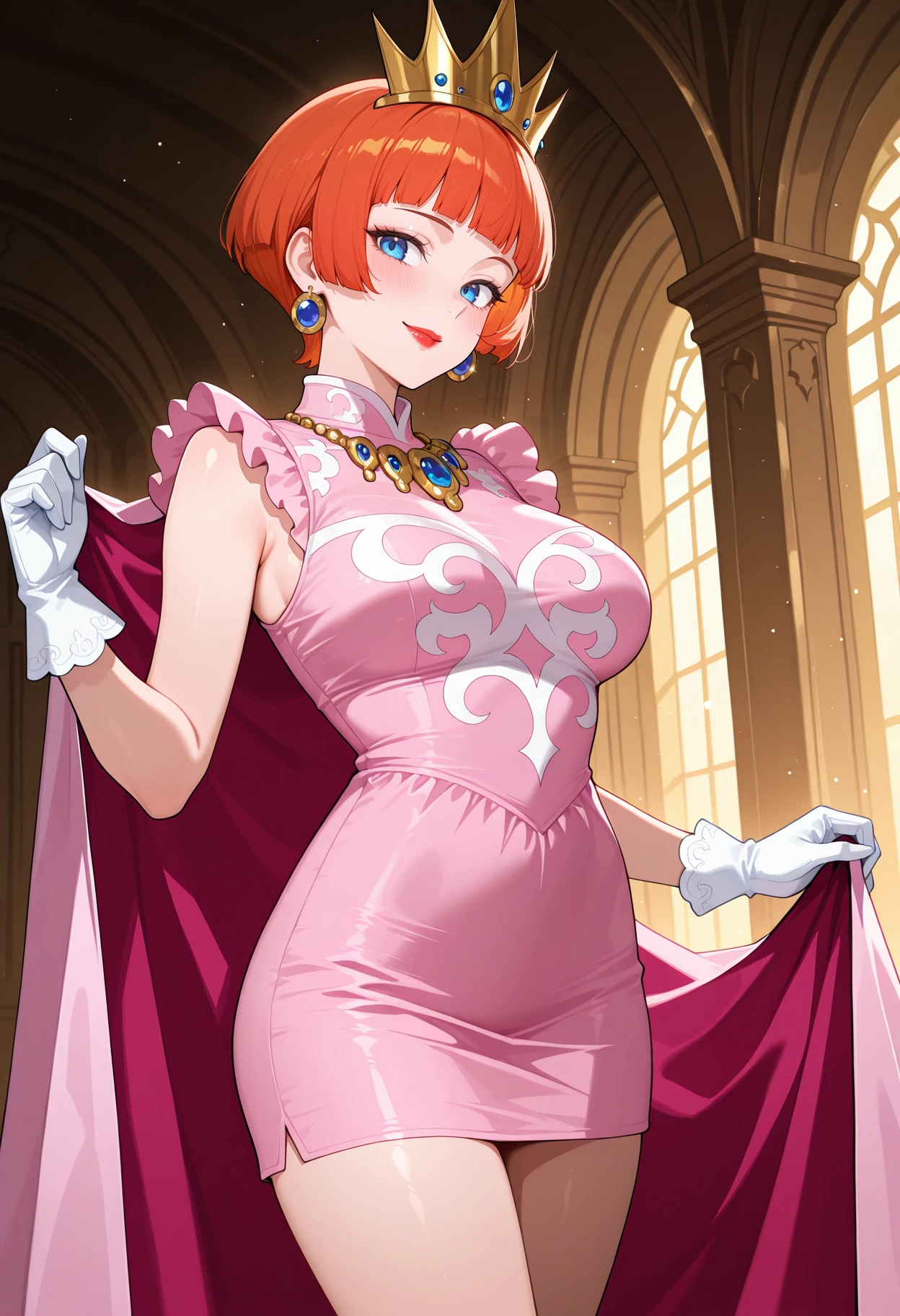 wlshkmtr, short hair, blunt bangs, bobcut, red hair, orange hair, blue eyes, mature female, lipstick, earrings, crown, pink dress, necklace, frilled sleeves, pink frills, sleeveless, pink cape, print dress, white gloves, short dress,