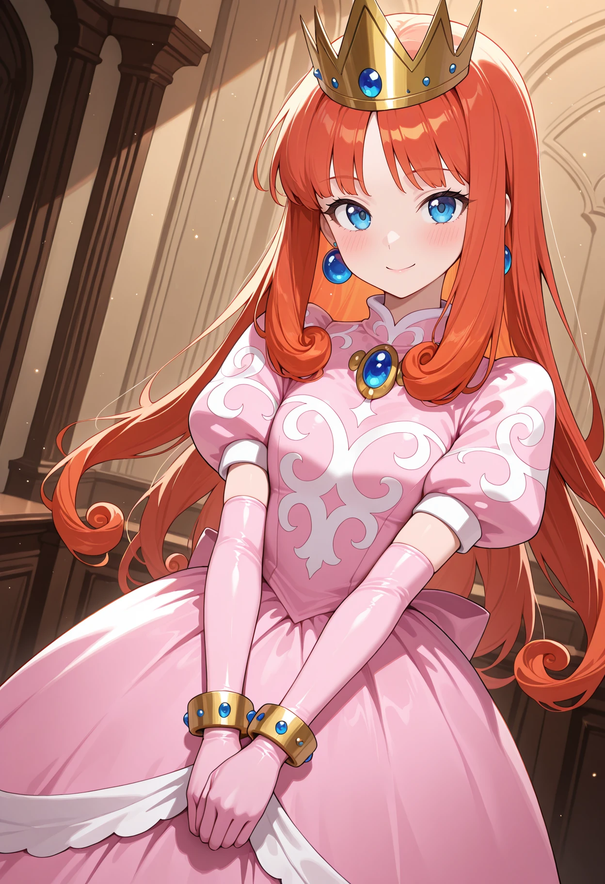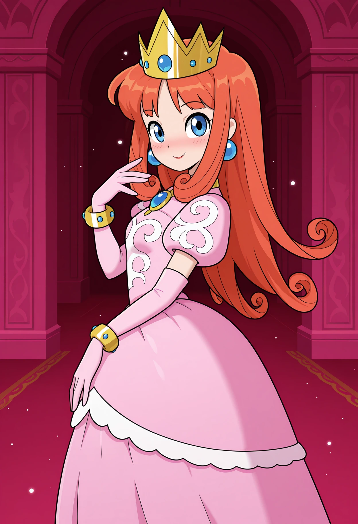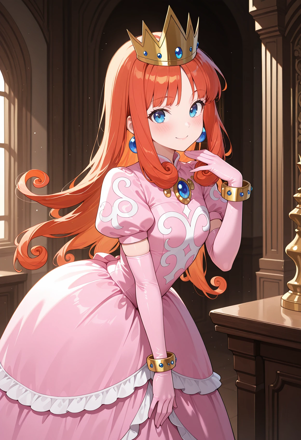 wlshkdef, long hair, red hair, orange hair, curly hair, blue eyes, earrings, crown, princess, pink dress, brooch, puffy short sleeves, print dress, elbow gloves, pink gloves, bracelet,