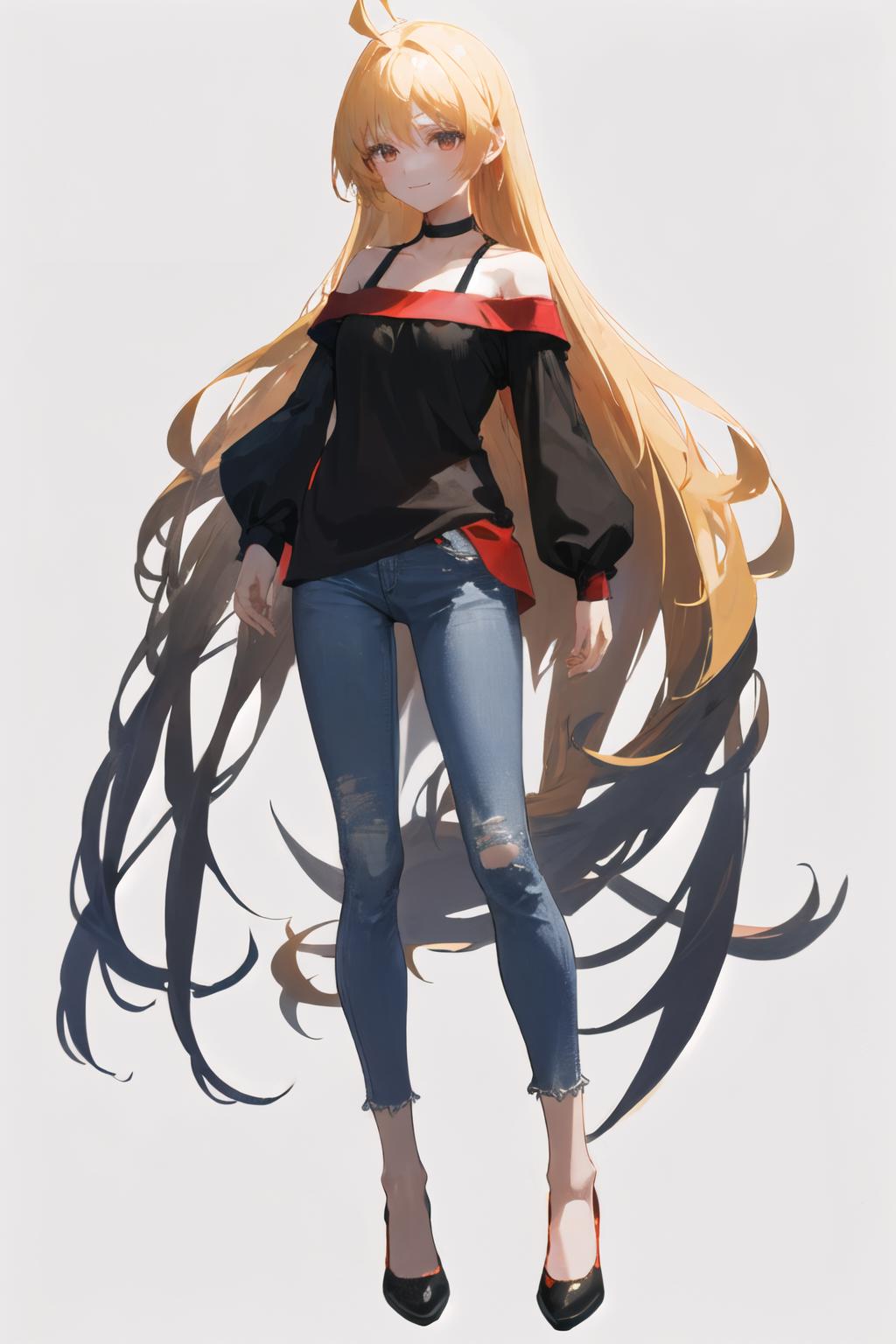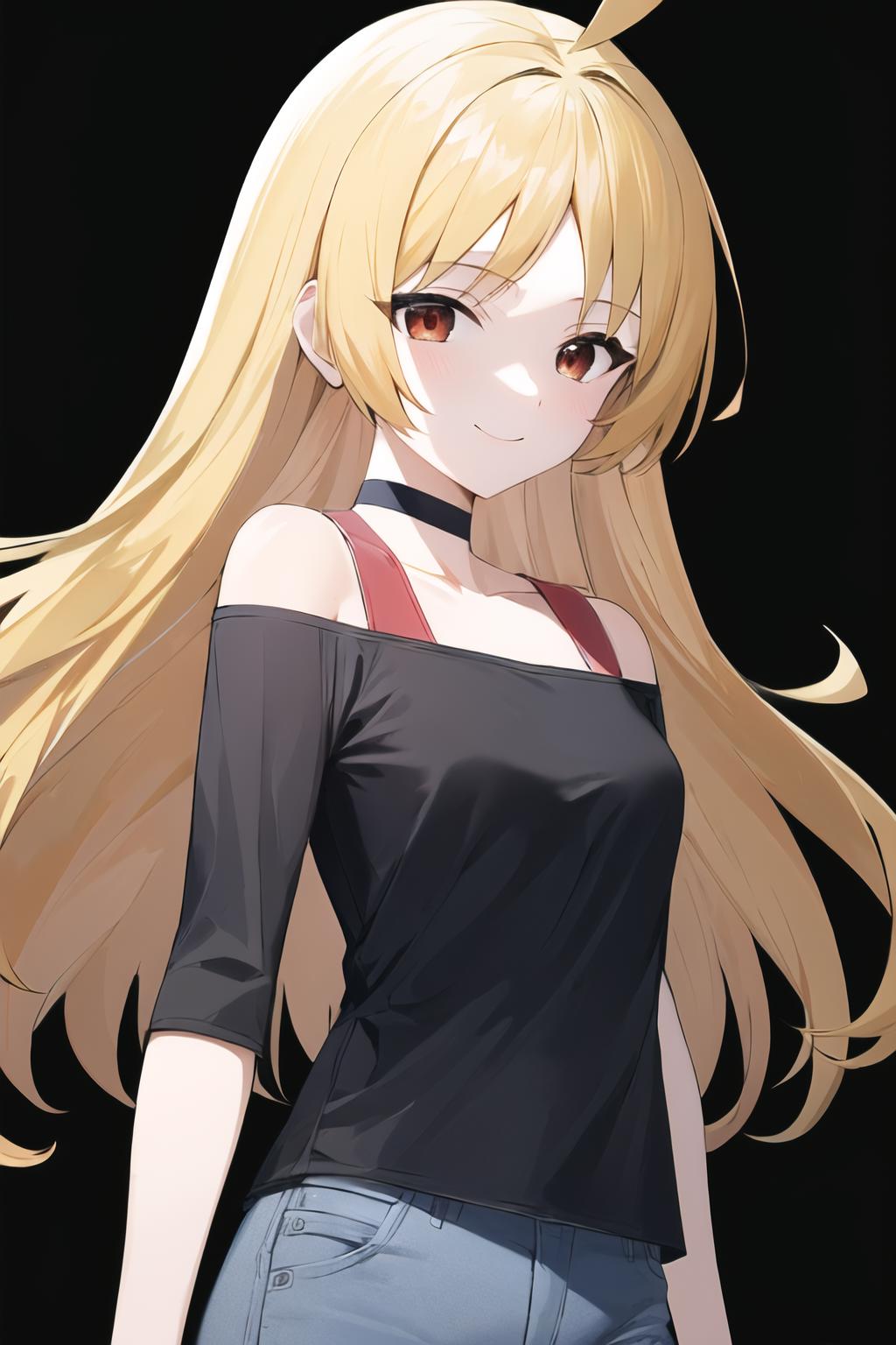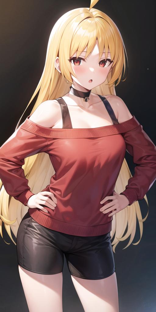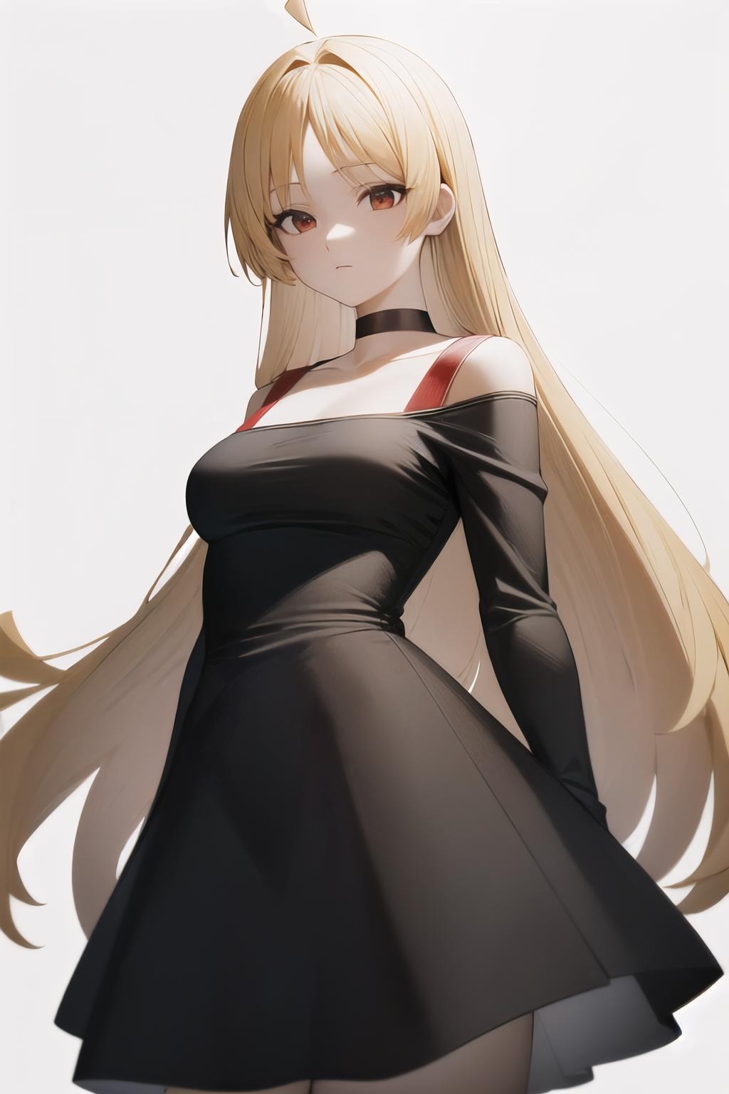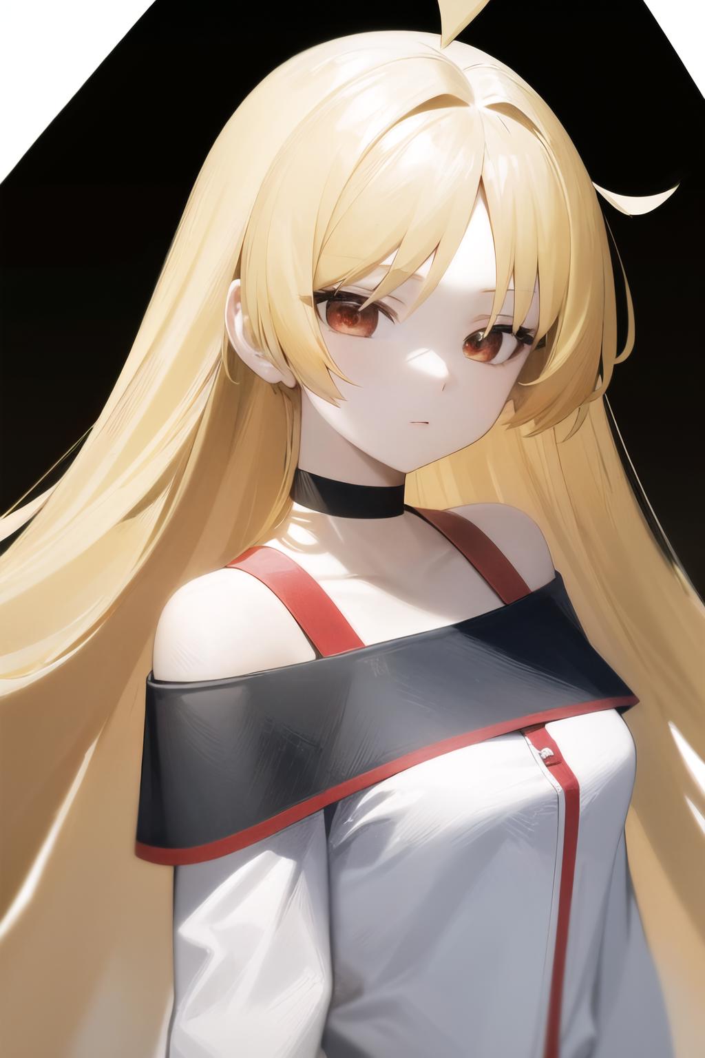 Recommeneded prompts: red eyes,long hair,ahoge,blonde hair,black choker,off shoulder,bangs (Check my sample pics for detail)