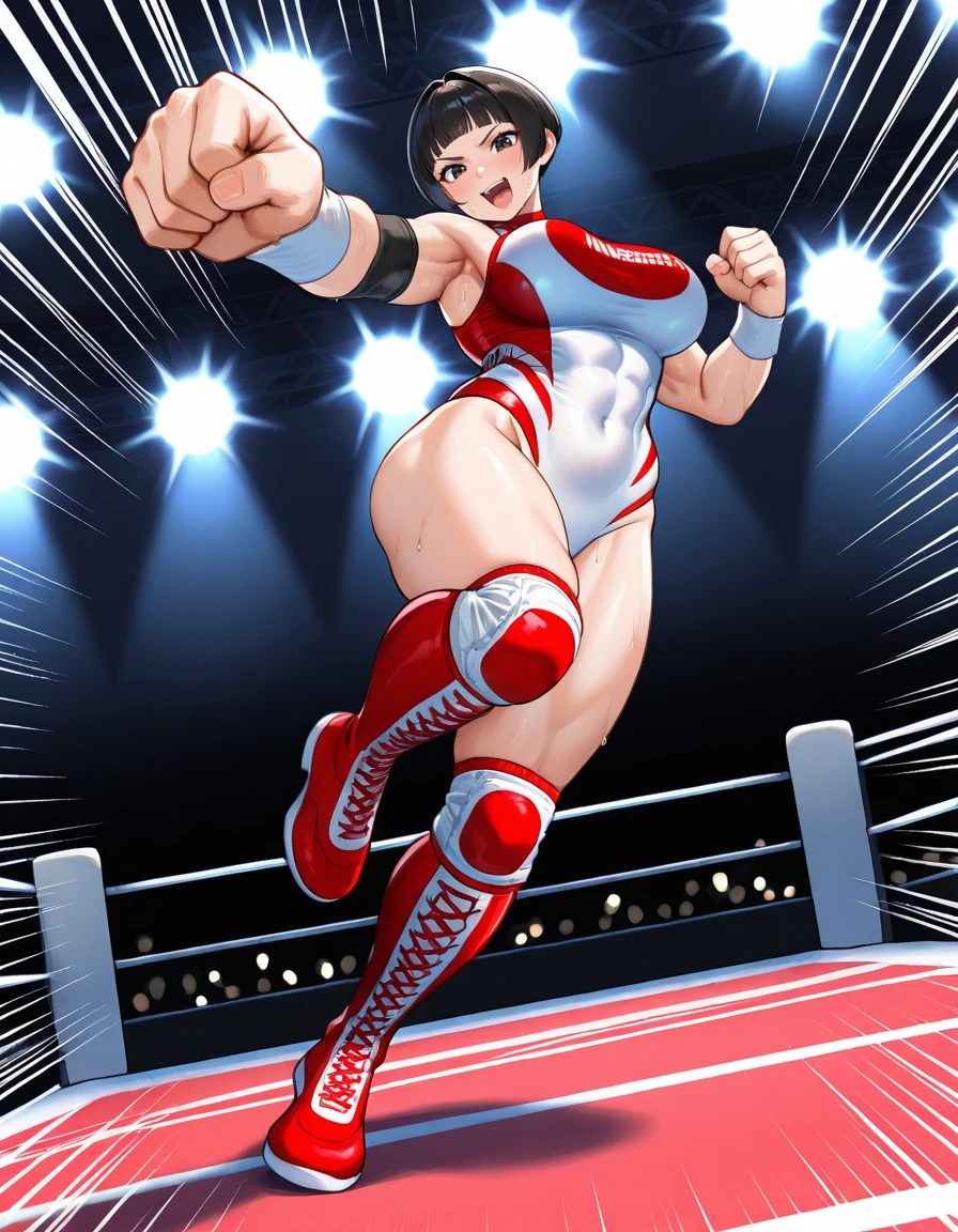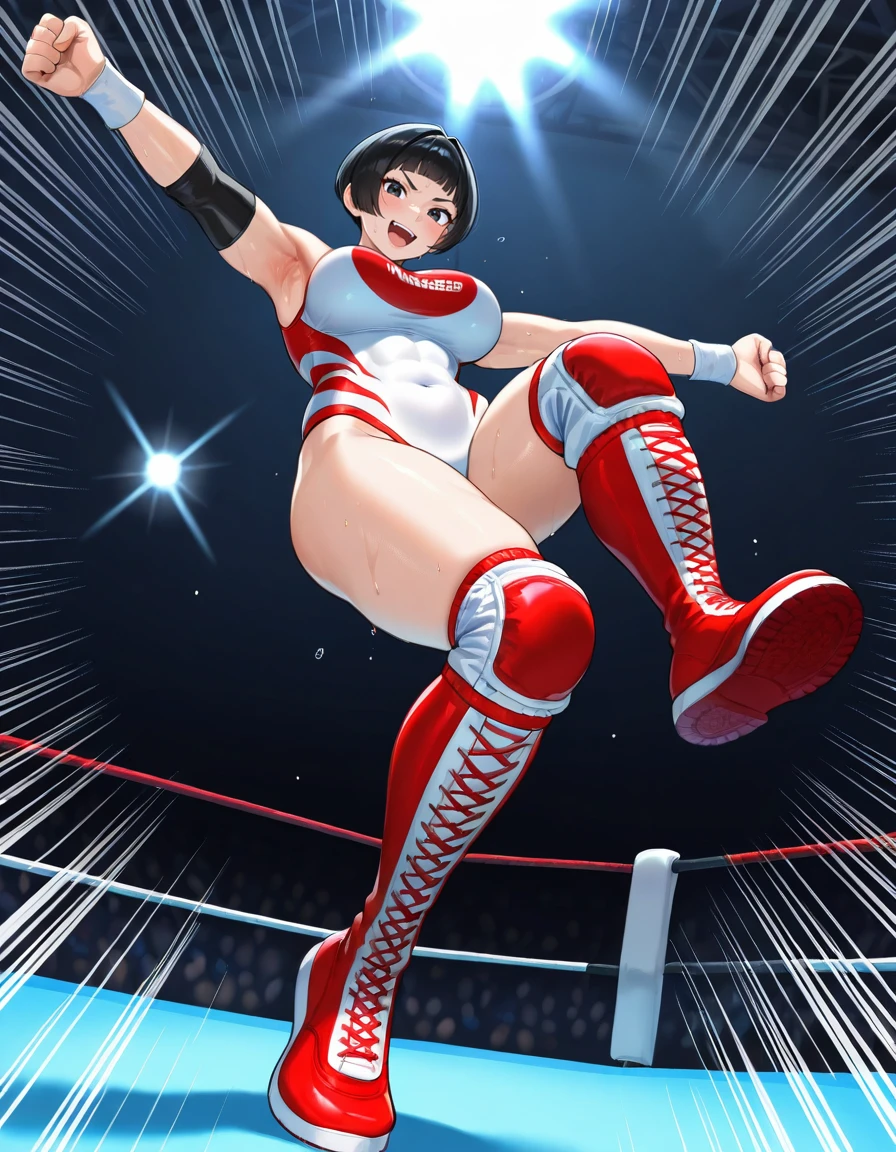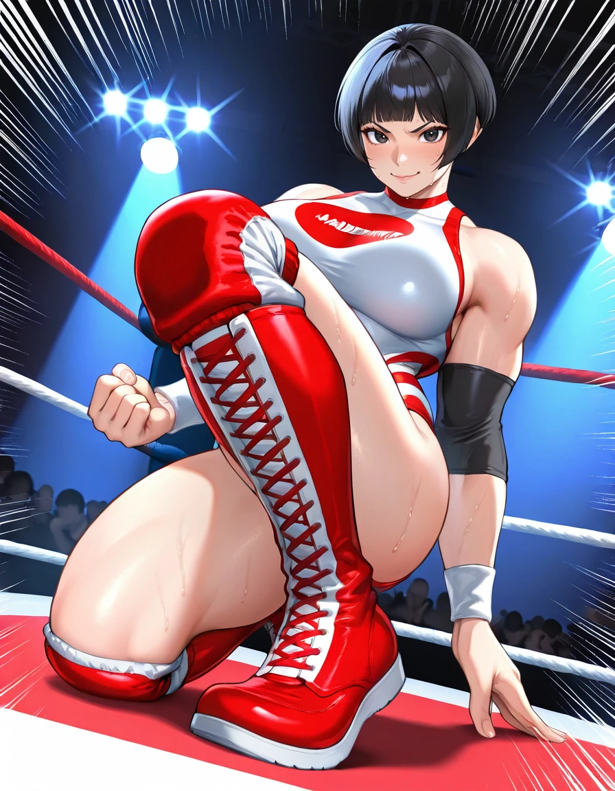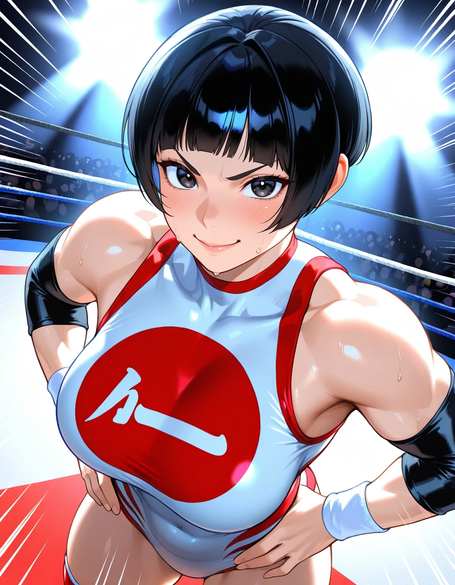 (sfv_nadeshiko), (black eyes, black hair, bowl cut, hair intakes, undercut, , apart), (nadeshiko_leotard, white leotard, nadeshiko_red_circle_text_, nadeshiko_black_single_elbow_sleeve, white wristband, nadeshiko_red_circle_knee_pads, red wrestling boots)